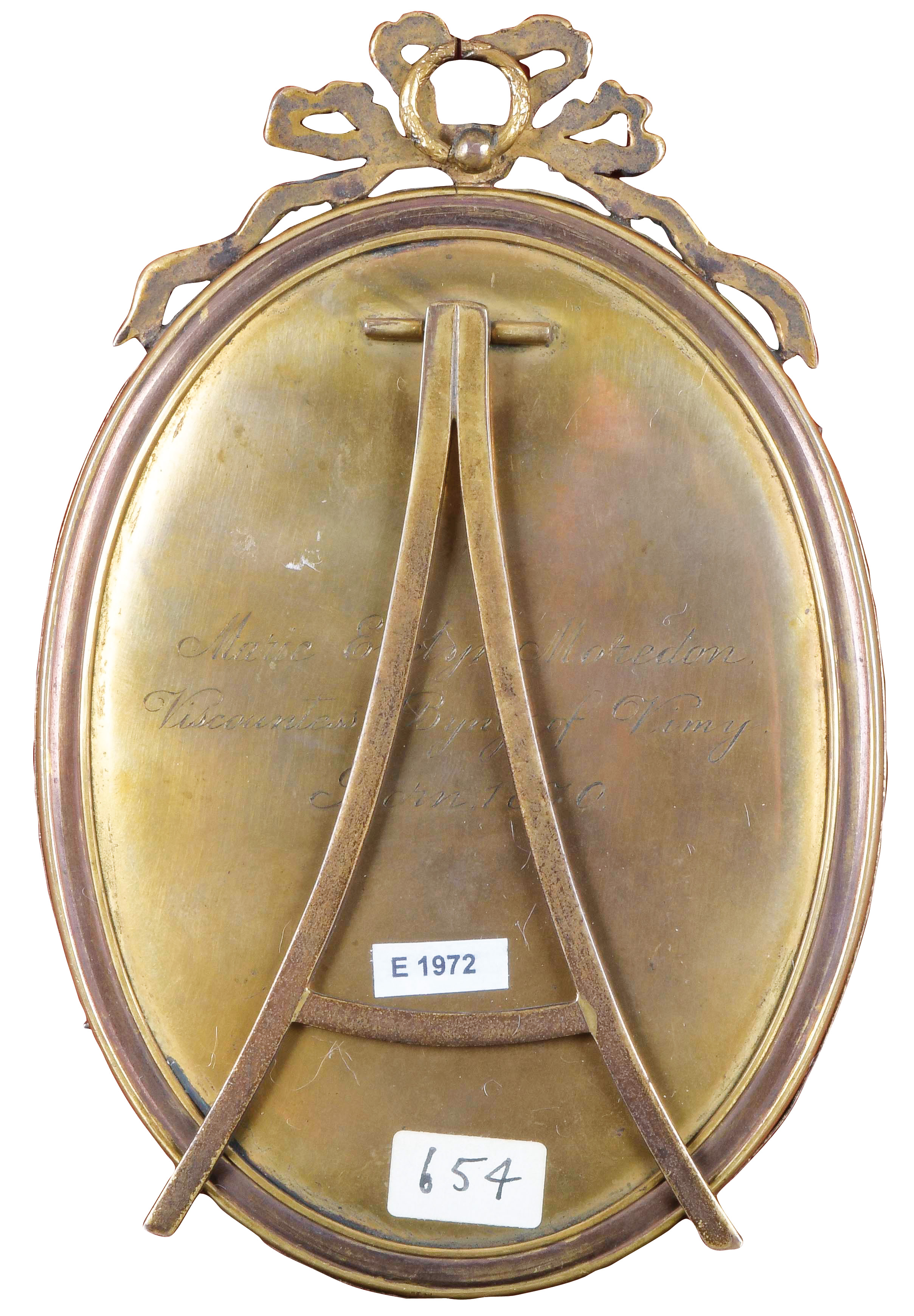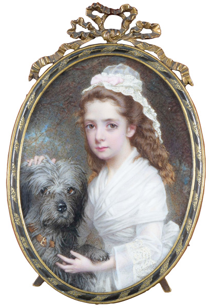 (1817-1887) Porträt von Evelyn Moreton Viscountess Byng of Vimy (1870-1949) mit Hund. Bunt gemalt in Puderfarben und aquarelliert auf Elfenbein, verso bez./dat. 1870, hi./Gl. in aufwendigem, teilw. ziseliertem Bronzerahmen. Provenienz: Slg. Frederick Joachim (1904-1994), London; Christie's, London, 8 March 1995; Christie's, London, 20 November 2013, GBP 46.000,00. Anmerkungen: Marie Evelyn war das einzige Kind von The Hon. Sir Richard Charles Moreton. Im Jahr 1902 heiratete sie Julian Hedworth George, 1. und letzter Viscount Byng of Vimy (1862-1935), der später der 12. Generalgouverneur von Kanada wurde. Lady Byng ist heute vor allem dafür bekannt, dass sie 1925 die Lady Byng Trophy der National Hockey League stiftete. Eduardo Lobo Moira (1817-1887) kam als Aktuar an der portugiesischen Botschaft nach London, bevor er sich als Miniaturmaler etablierte. Obwohl er keine formale Ausbildung erhalten hatte, war Moira der stilistische Nachfolger von Robert Thorburn und verwendete ähnlich grosse Blätter aus Elfenbein. Er wurde schnell populär, stellte in der Royal Academy aus und wurde von Königin Victoria gefördert. Dreizehn Miniaturen von ihm, die Mitglieder der königlichen Familie zeigen, sind heute in der Royal Collection erhalten. Seine Witwe, Eugenia, erhielt in Anerkennung der Verdienste ihres Mannes eine jährliche Pension von £25 von der Königin. Moira war einer der Miniaturmaler, die von der Wiederbelebung der Porträtminiatur im späten 19. Jahrhundert profitierten. In einem Brief an Sir Henry Ponsonby, datiert auf den 26. Januar 1887, schrieb seine Witwe: „Für mehrere Jahre waren die Zeiten für Miniaturmaler sehr schlecht, aufgrund des schnellen Fortschritts der Fotografie, aber gerade jetzt schien es eine regelrechte Wiederbelebung zu geben und Herr Moira hatte mehr Aufträge für Miniaturen zum Zeitpunkt seines Todes, als er seit 16 oder 17 Jahren gehabt hatte, sodass er einer Zeit des Wohlstands entgegensah.“ (Royal Archives, PP/VIC/ADD 2605). Ausstellung: „Royal Academy“, London 1878, Nr. 1293. Elfenbein-Gutachten und EU-Verkaufsgenehmigung liegen vor und können für EUR 150,00 erworben werden.- 10,7 x 7,8 / 13,5 x 8,8 cm € 9.000,- - Katalog-Nr: 114Deutscher Miniaturist