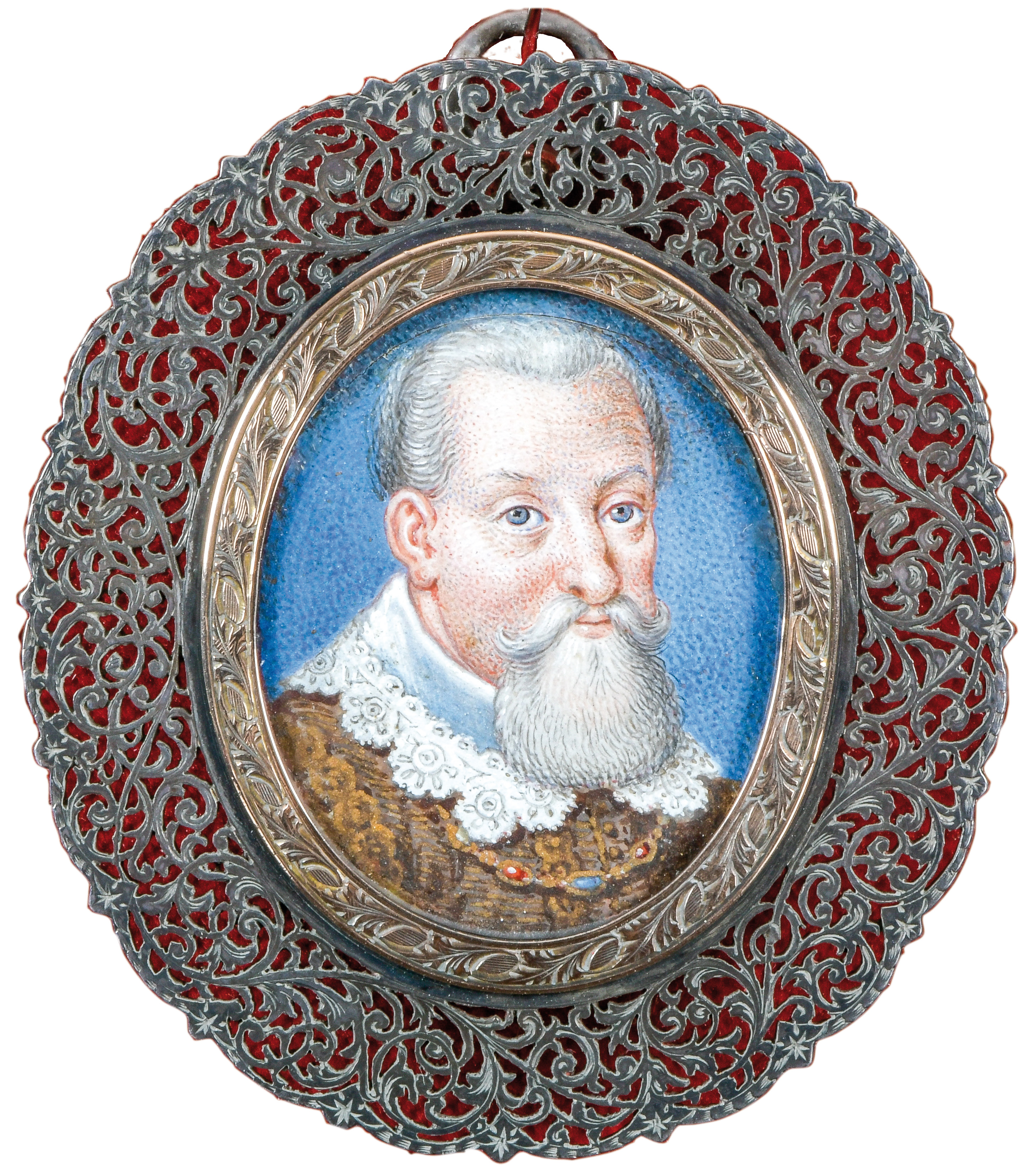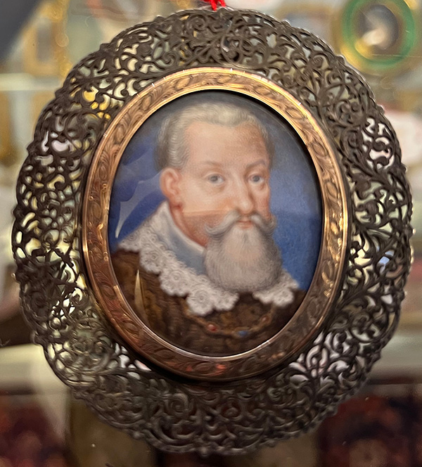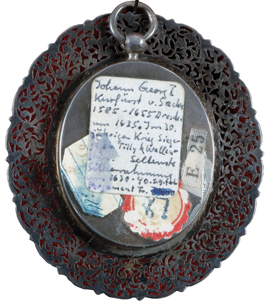des 17. Jhs. Porträt von Johann Georg I, Kurfürst von Sachsen (1585-1656). Bunt gemalt in Puderfarben und aquarelliert auf Pergament, hi./Gl. in aufwendig floral durchbrochenem Silberrahmen mit Goldrand. Provenienz: Kunsthandel Edwin Bucher, Trogen 1979. 3,4 x 2,7 / 6 x 5,4 cm € 1.200,- - Katalog-Nr: 115Jean-Daniel Welper