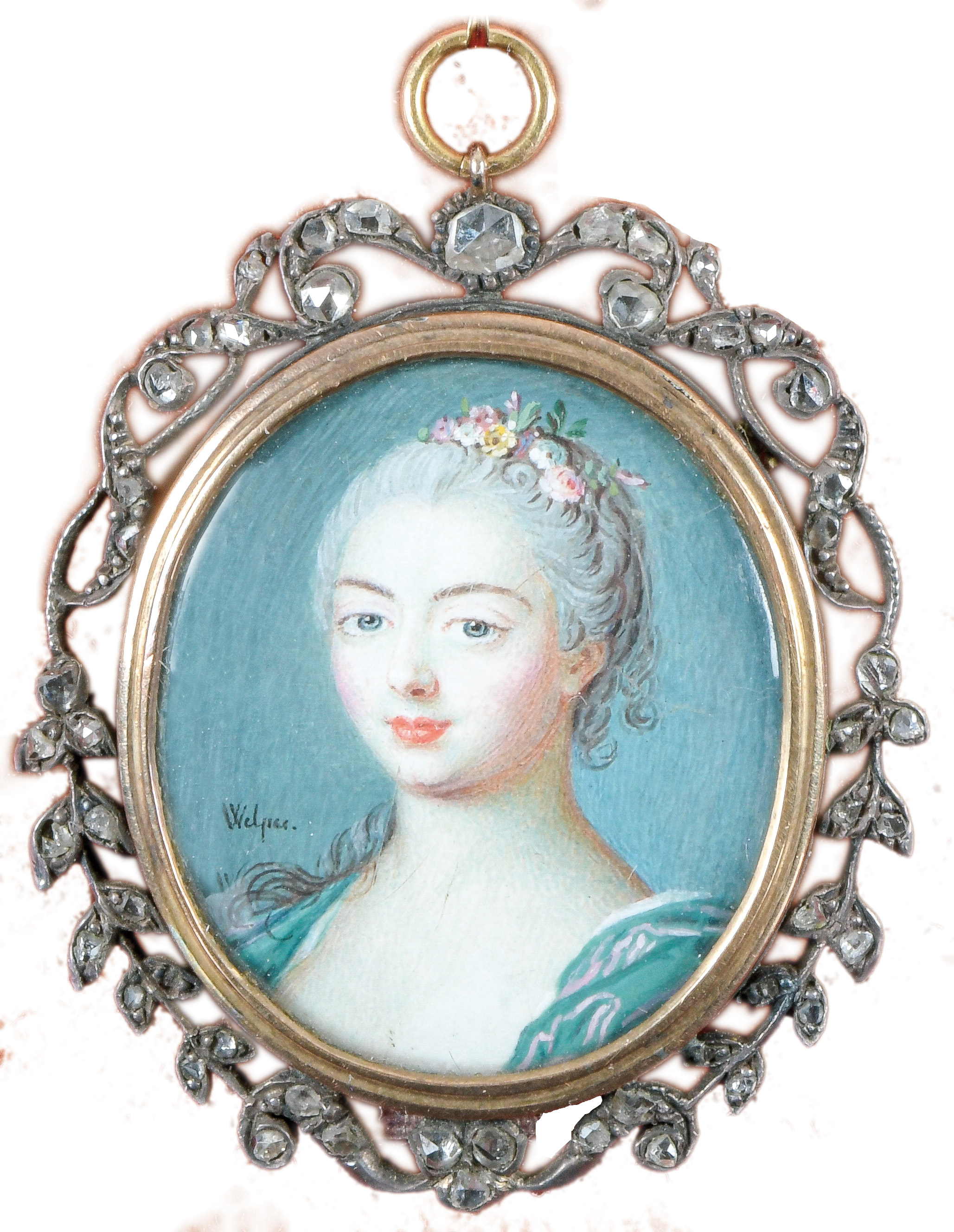 (1729/30-1789) Porträt einer Dame. Bunt gemalt in Puderfarben und aquarelliert auf Pergament, li./u./sign., hi./Gl. in durchbrochenem Silberrahmen, besetzt mit Diamanten; verso emailliert und beschriftet. Provenienz: Sotheby's, Genf 11. Nov. 1981. 2,4 x 2,1 /3,7 x 3,2 cm € 5.000,- - Katalog-Nr: 116Jean Laurent Mosnier