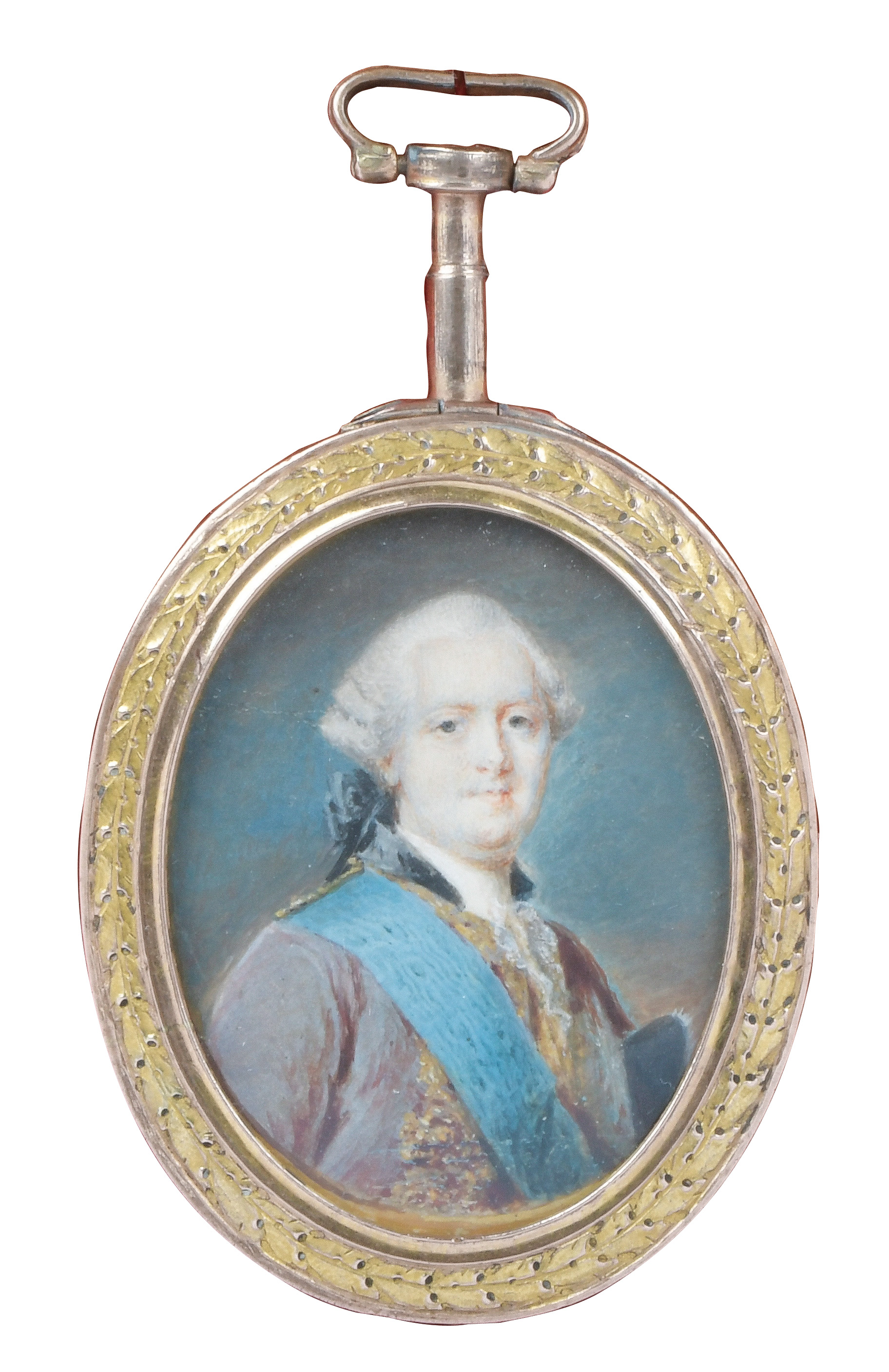 des 18. Jhs. Porträt eines Herren. Bunt gemalt in Puderfarben und aquarelliert auf Elfenbeinplatte, hi./Gl. in aufwendig floral reliefiertem, vergoldetem Bronzerahmen. Provenienz: Sotheby's, Genf 6. Mai 1981. Elfenbein-Gutachten und EU-Verkaufsgenehmigung liegen vor und können für EUR 150,00 erworben werden. 4,8 x 3,7 / 5,9 x 4,8 cm € 1.000,- - Katalog-Nr: 124Alexandre Delatour