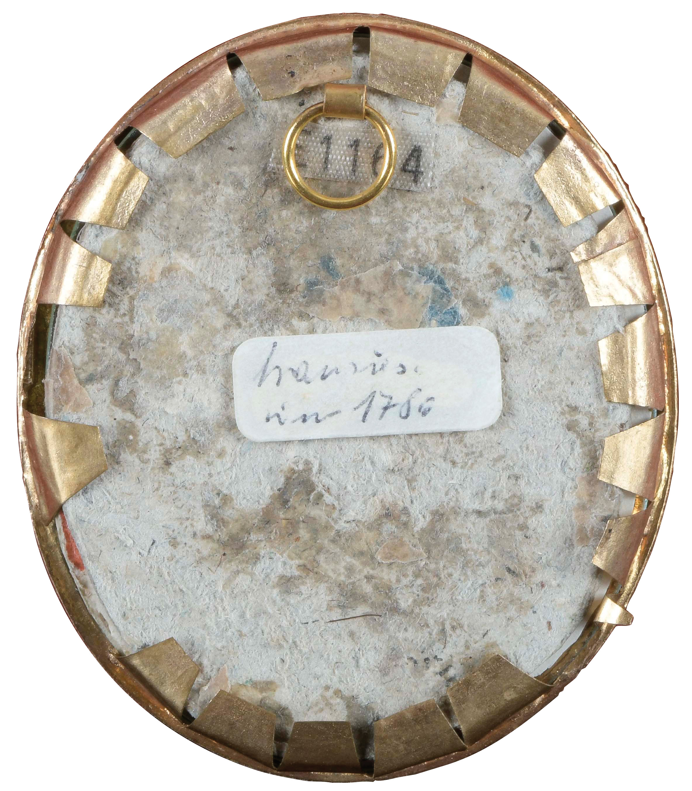des 18. Jhs. Porträt eines Mädchens. Bunt gemalt in Puderfarben und aquarelliert auf Elfenbeinplatte, hi./Gl. in 14 kt Goldrahmen, verso verglast. Provenienz: Kunsthandel Edwin Bucher, Trogen 1985. Elfenbein-Gutachten und EU-Verkaufsgenehmigung liegen vor und können für EUR 150,00 erworben werden. 5,7 x 4,9 / 6,3 x 5,4 cm € 360,- - Katalog-Nr: 108Anton Oechs