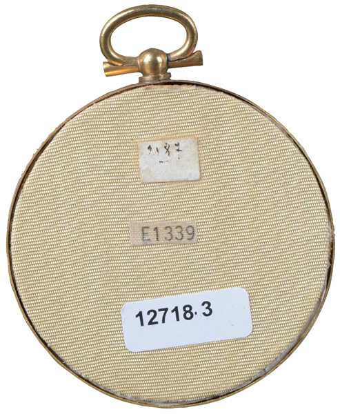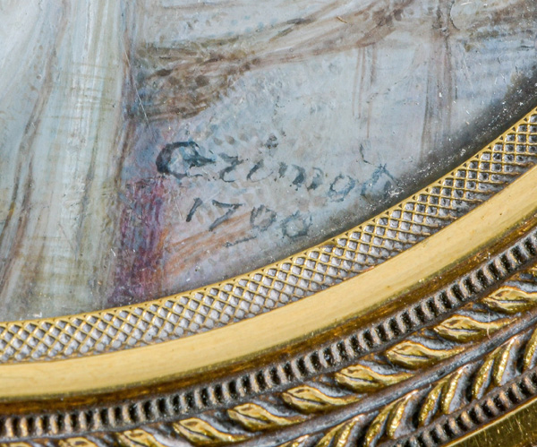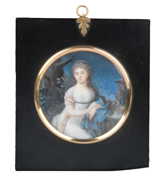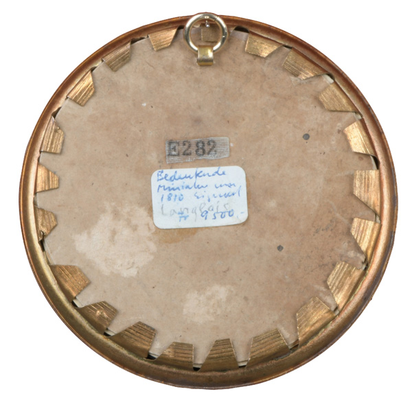 (deutscher Miniaturist des 18. Jhs.) Porträt der Herzogin von Mecklenburg-Schwerin (1779-1801). Bunt gemalt in Puderfarben und aquarelliert auf Elfenbeinplatte, sign./dat. 1802, hi./Gl. in aufwendigem, graviertem Messingrahmen. Provenienz: Christie' s, Genf 29. Nov. 1982. Elfenbein-Gutachten und EU-Verkaufsgenehmigung liegen vor und können für EUR 150,00 erworben werden. D=7 / 8,2 cm € 400,- - Katalog-Nr: 121Miniaturist