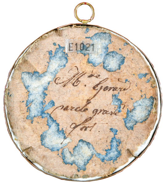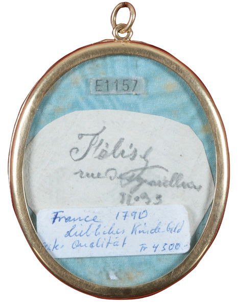 des 18. Jhs. Porträt eines Mädchens mit blauem Haarband. Bunt gemalt in Puderfarben und aquarelliert auf Elfenbeinplatte, mit Passepartout hi./Gl. in aufwendig kronenförmig durchbrochenem Messingrahmen. Provenienz: Christie's, London 27. Nov. 1979. Elfenbein-Gutachten und EU-Verkaufsgenehmigung liegen vor und können für EUR 150,00 erworben werden. 5,3 x 4,5 / 6 x 4,9 cm € 600,- - Katalog-Nr: 122Louis-Ami Arlaud-Jurine