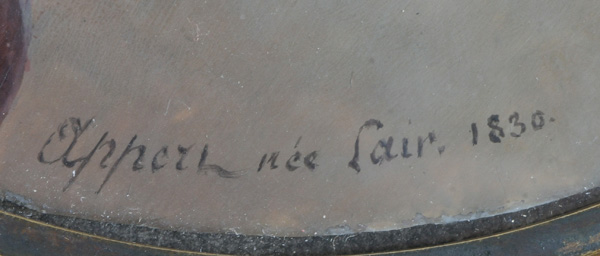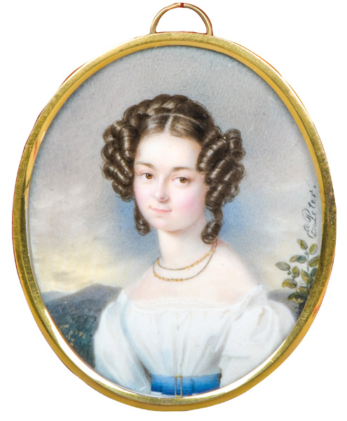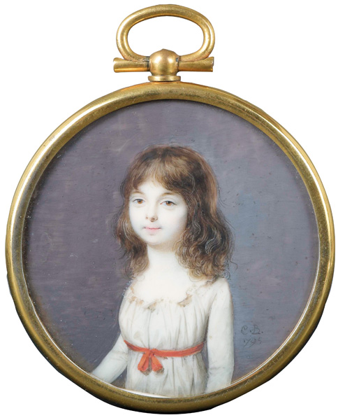 (1759-1832) Porträt eines Mädchens. Bunt gemalt in Puderfarben und aquarelliert auf Elfenbeinplatte, re./u./monogr./dat. 1795, hi./Gl. in vergoldetem Bronzerahmen. Provenienz: Sotheby's, London 9. Juni 1986. Elfenbein-Gutachten und EU-Verkaufsgenehmigung liegen vor und können für EUR 150,00 erworben werden. D=5,9 / 6,5 cm € 360,- - Katalog-Nr: 105Pauline Appert