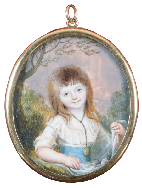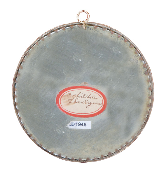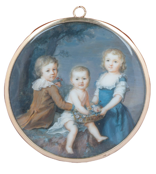 (1770-1806) Poträt der drei Kinder des Lords Robert Seymour (1748-1831): Elizabeth (1775-1848), Henry (1776-1843) und Frances Isabella (1785-1838). Bunt gemalt in Puderfarben und aquarelliert auf Elfenbeinplatte, re./mittig/sign., hi./Gl. in schlichtem 18 kt Goldrahmen. Provenienz: Bonhams, London 28. Juni 2012. Elfenbein-Gutachten und EU-Verkaufsgenehmigung liegen vor und können für EUR 150,00 erworben werden. D=7,3 / 7,8 cm € 2.800,- - Katalog-Nr: 113Eduardo de Moira