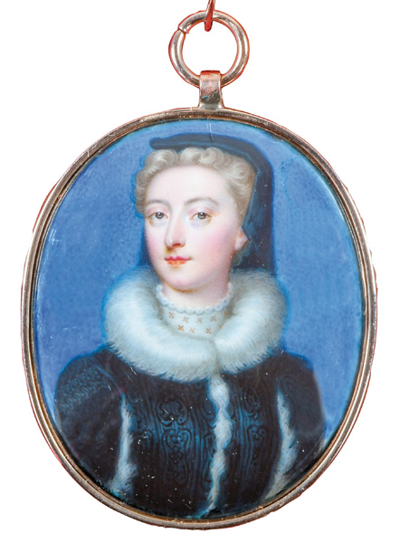 (1701-1766) Porträt der Königin Luise Ulrike von Schweden (1720-1766), Schwester von Friedrich dem Großen. Bunt gemalt in Puderfarben und aquarelliert auf Pergament, in schlichtem, goldfarbenem Rahmen. Provenienz: Christie's, London 27. April 1982. D=6,7 / 7,2 cm € 1.200,- - Katalog-Nr: 120H. Abel