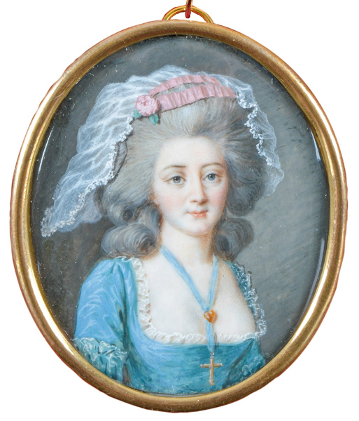(1780-1858) attrib. Porträt einer Dame in blauem Kleid. Bunt gemalt in Puderfarben und aquarelliert auf Elfenbeinplatte, hi./Gl. gerahmt. Provenienz: Sotheby's, Zürich 6. Mai 1980. Elfenbein-Gutachten und EU-Verkaufsgenehmigung liegen vor und können für EUR 150,00 erworben werden. 5,1 x 4,4 / 5,8 x 4,8 cm € 400,- - Katalog-Nr: 125Französischer Miniaturist