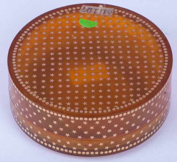 des 18. Jhs. Porträt einer Dame mit Haube. Bunt gemalt in Puderfarben und aquarelliert auf Elfenbeinplatte, mit ovalem, reliefiertem Goldkranz hi./Gl. eingelassen in runde, polierte Horndose mit Goldsterneinlagen. Provenienz: Sotheby's, London 24. März 1980. Elfenbein-Gutachten und EU-Verkaufsgenehmigung liegen vor und können für EUR 150,00 erworben werden. 4,2 x 3,5 cm / H=2,5 cm, D=6,3 cm € 800,-