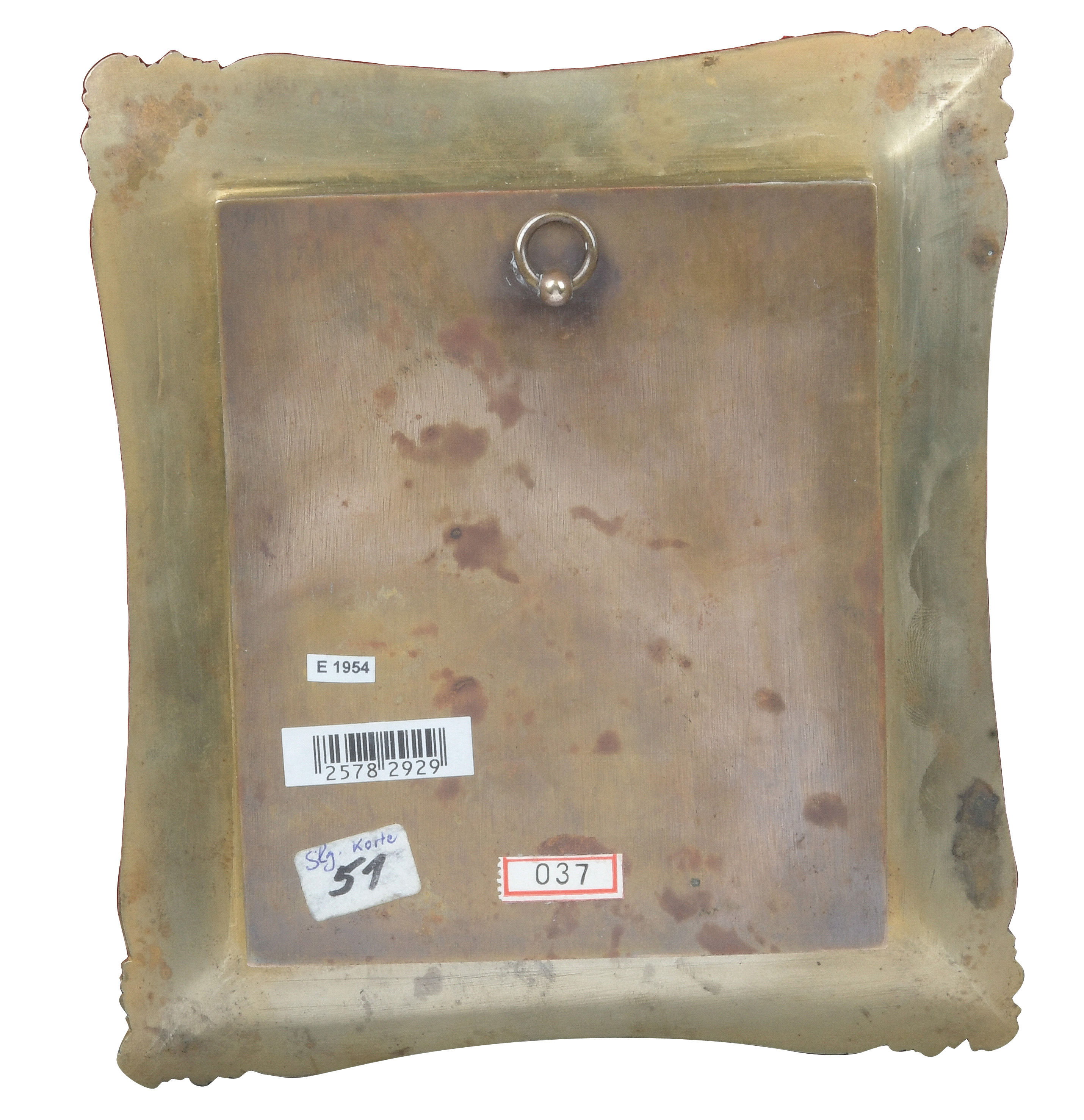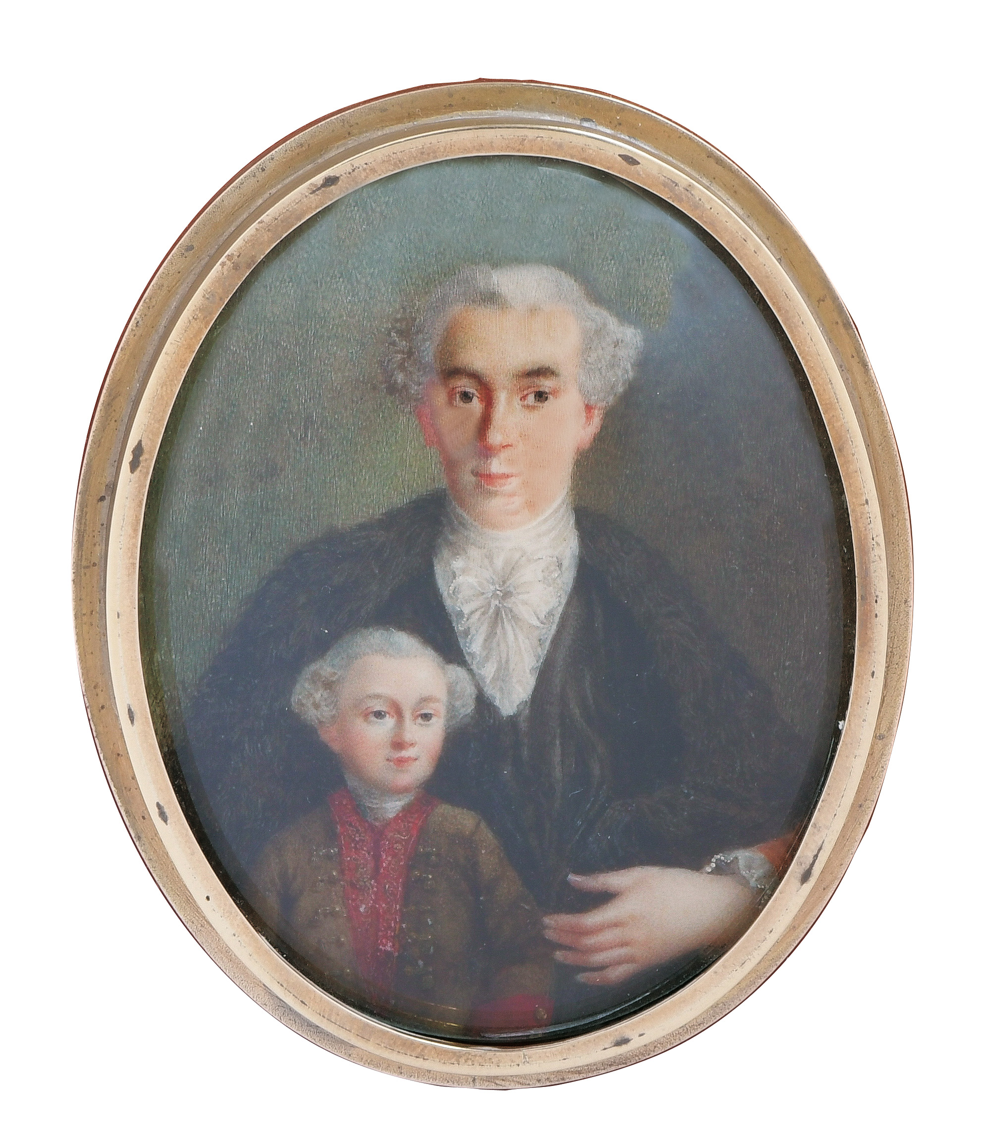 des 18. Jhs. Doppelporträt eines Vaters mit Sohn. Bunt gemalt in Puderfarben und aquarelliert auf Elfenbeinplatte, hi./Gl. in schlichtem Messingrahmen. Provenienz: Sotheby's, Zürich 13. Nov. 1979. Elfenbein-Gutachten und EU-Verkaufsgenehmigung liegen vor und können für EUR 150,00 erworben werden. 7,2 x 5,6 / 8,4 x 6,8 cm € 400,- - Katalog-Nr: 134Russischer Miniaturist