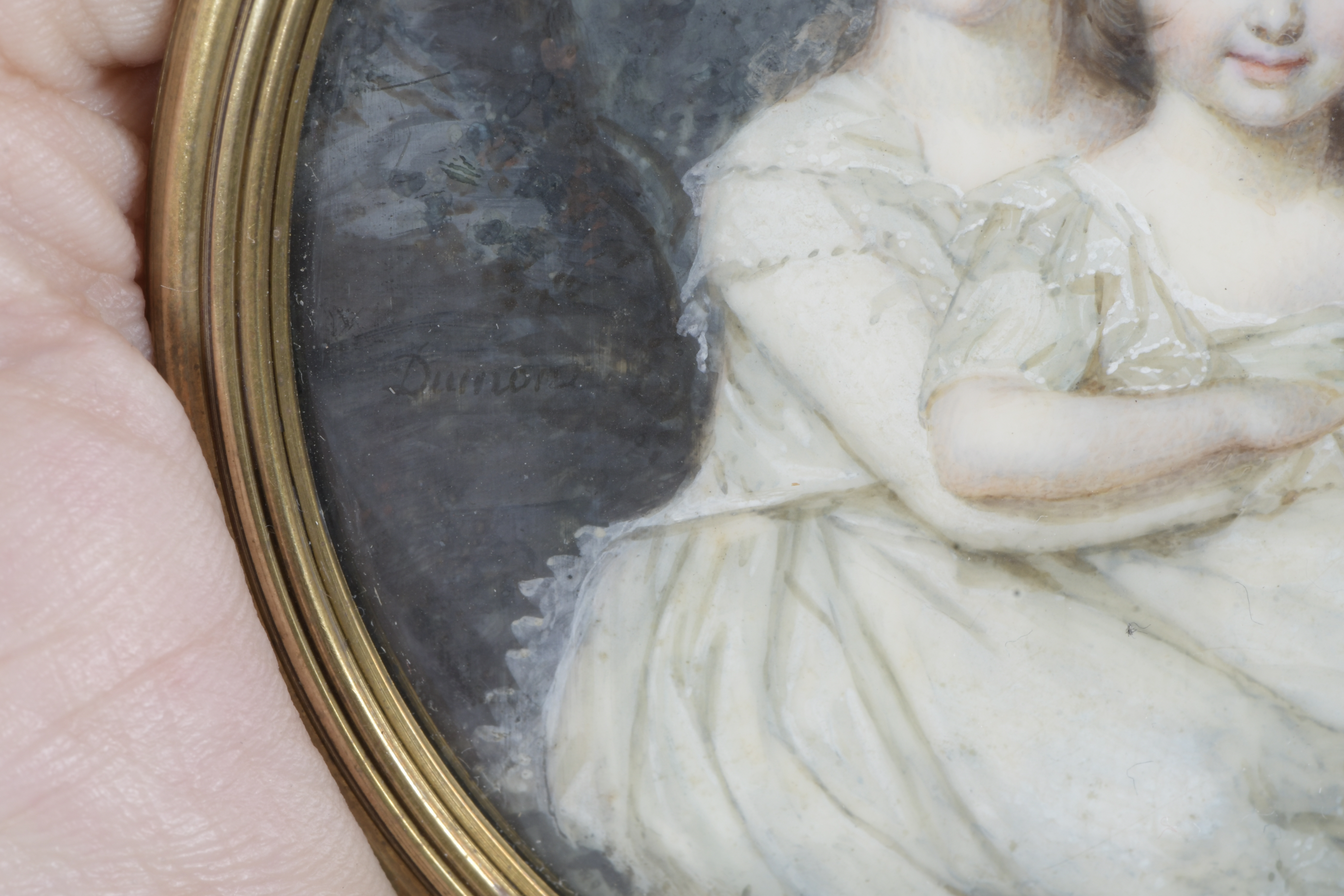 (1772-1838) Porträt von Dorette Spor, geb. Scheidler (1787-1834). Bunt gemalt in Puderfarben und aquarelliert auf Elfenbeinplatte, re./u./sign., hi./Gl. in aufwendig rocaillereliefiertem, feuervergoldetem Bronzerahmen. Provenienz: Christie's, London 28. Nov. 2012; davor Slg. Kotte, Lempertz, 9. Dez. 1933. Elfenbein-Gutachten und EU-Verkaufsgenehmigung liegen vor und können für EUR 150,00 erworben werden. 11,9 x 9,7 / 18,2 x 15,8 cm € 2.500,- - Katalog-Nr: 129François Dumont