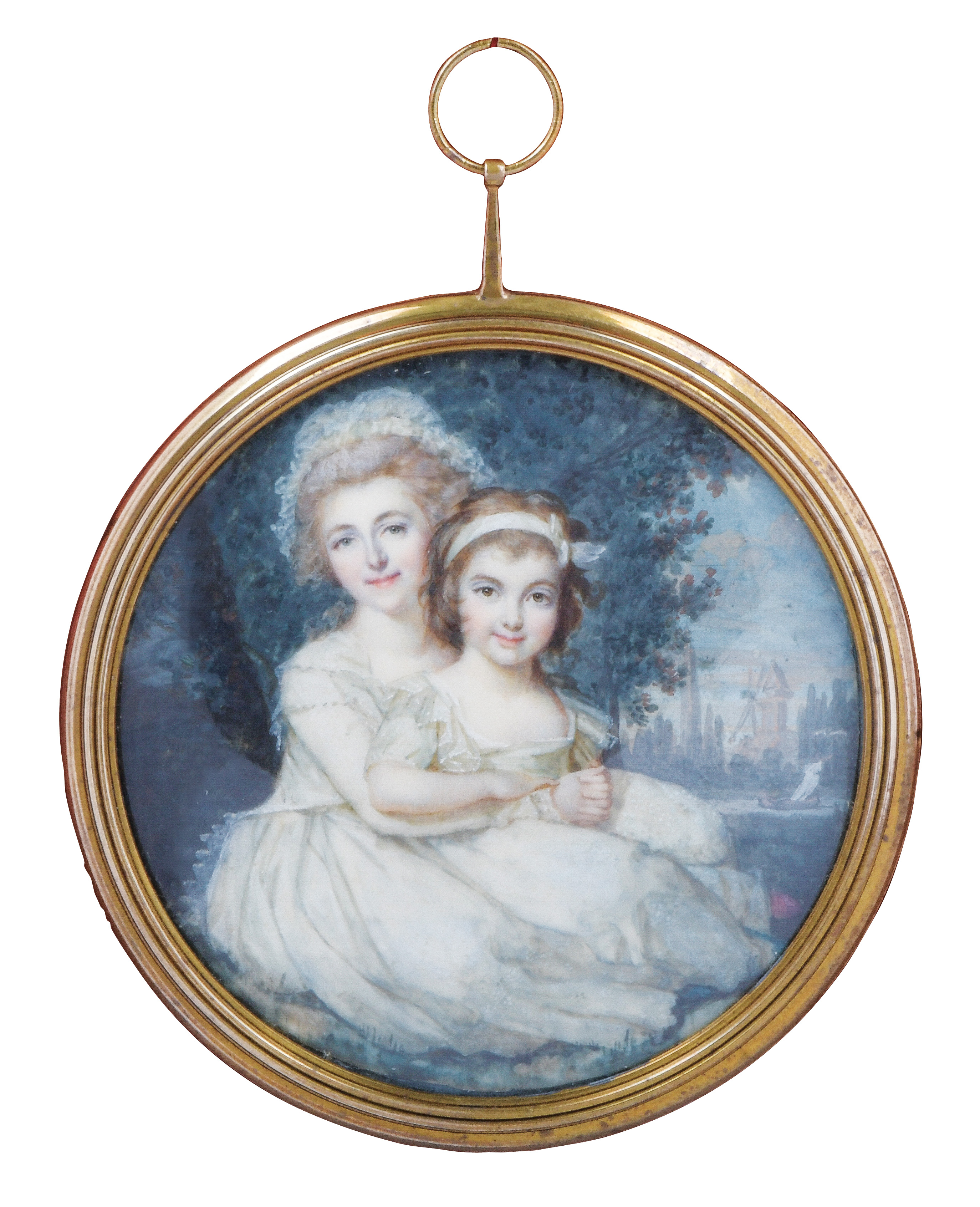 (1751-1831) Porträt der Madame Sauveige mit einem Mädchen auf dem Schoß. Bunt gemalt in Puderfarben und aquarelliert auf Elfenbeinplatte, li./mittig/sign., hi./Gl. in schlichtem, profiliertem Messingrahmen. Provenienz: : Christie' s, London 28. Mai 2002 für GBP 48.000,00. Vgl. Lt. zweitem Honorarbuch des Künstlers, Nationalbibliothek Frankreich, Stiftung Jacques Doucet, Folio 11, 10.-20. Jan 1790: „Mde Sauveige et une jeune Dlle 35 (Louis d'or)“. Elfenbein-Gutachten und EU-Verkaufsgenehmigung liegen vor und können für EUR 150,00 erworben werden. D=7,4 / 8,3 cm € 7.500,- - Katalog-Nr: 130Englischer Miniaturist