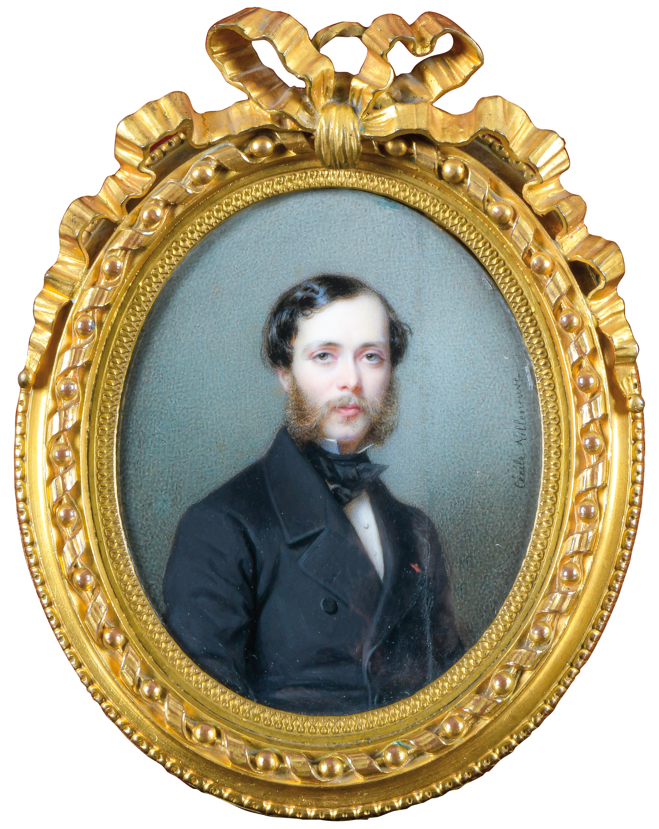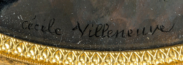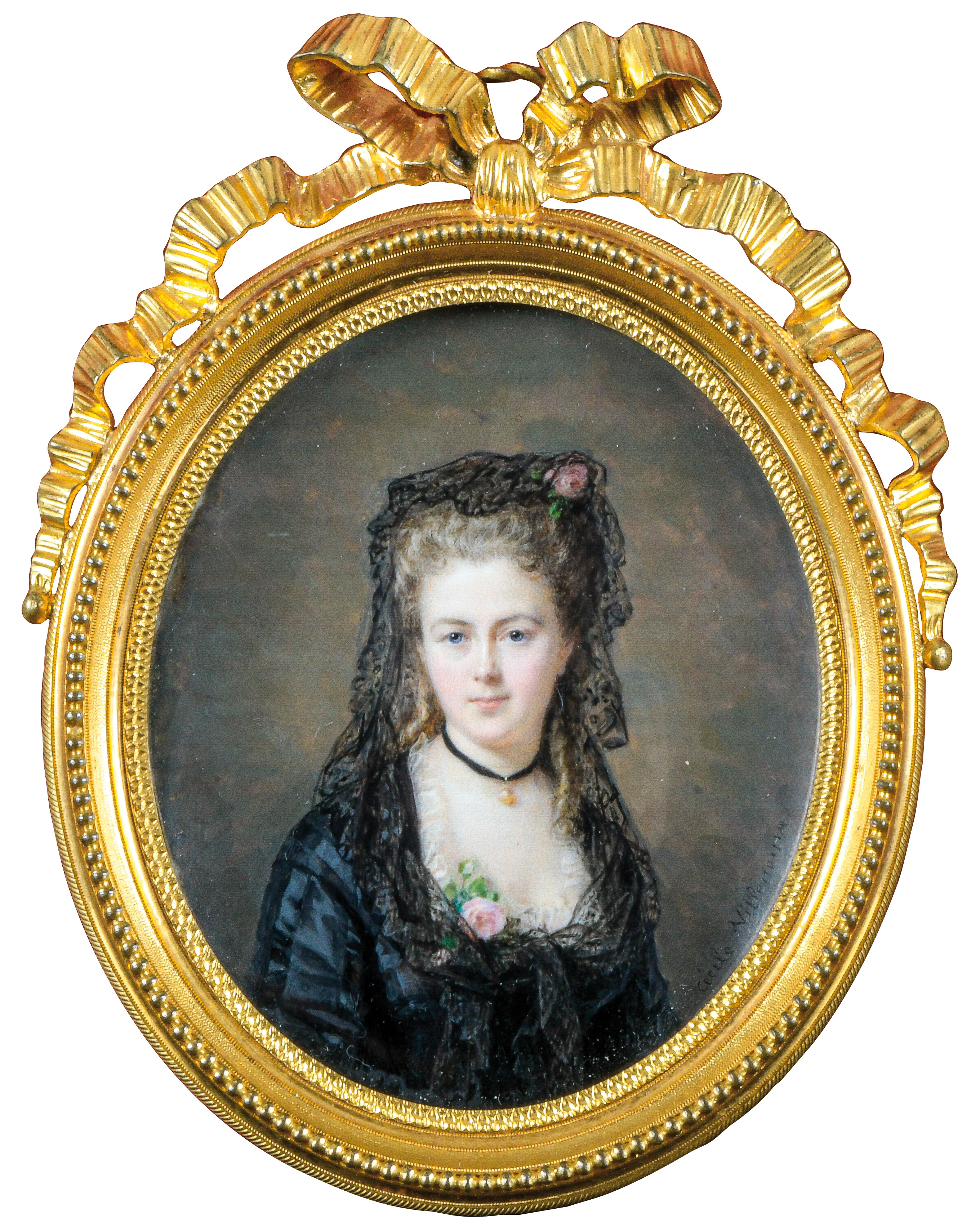 (1824-1901) Porträt der „Vicomtesse Geoffroy de Ruillé“. Bunt gemalt in Puderfarben und aquarelliert auf Elfenbein, re./u./sign., verso bez./dat. 1872, hi./Gl. in aufwendig reliefiertem, feuervergoldetem Bronzerahmen von Alphonse Giroux & Cie, Paris. Provenienz: Christie's, London 25. Mai 2004, GBP 32.000,00. Elfenbein-Gutachten und EU-Verkaufsgenehmigung liegen vor und können für EUR 150,00 erworben werden. 10,3 x 8,6 / 15,2 x 11,7 cm € 5.500,- - Katalog-Nr: 142Cécile Villeneuve, geb. Colombet