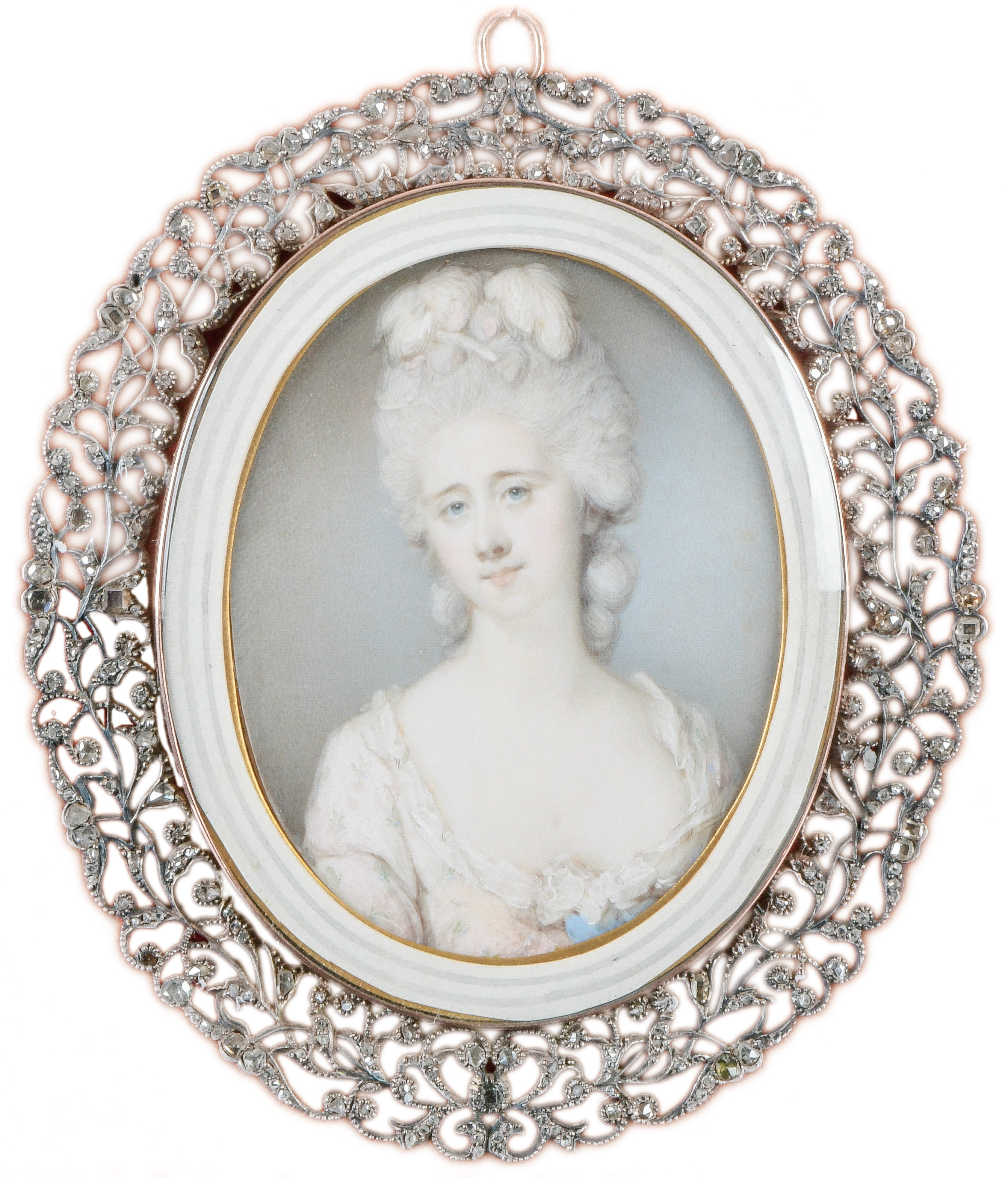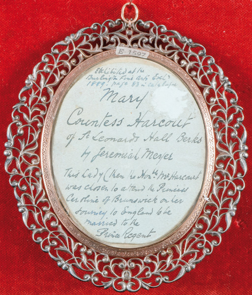 (1735-1789) attrib. Porträt von Mary Countess Harcout, spätere Gräfin Harcout. Bunt gemalt in Puderfarben und aquarelliert auf Elfenbeinplatte, hi./Gl. in aufwendig durchbrochenem Silberrahmen, besetzt mit Diamanten; verso ausführlich beschriftet. Provenienz: Sotheby's, Genf 15. Nov. 1990. Elfenbein-Gutachten und EU-Verkaufsgenehmigung liegen vor und können für EUR 150,00 erworben werden. 8 x 6,2 / 12,7 x 11,2 cm € 2.000,- - Katalog-Nr: 146John Smart
