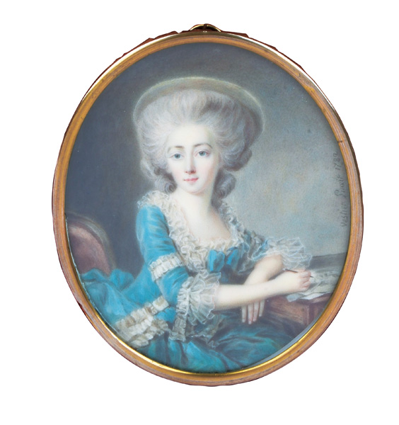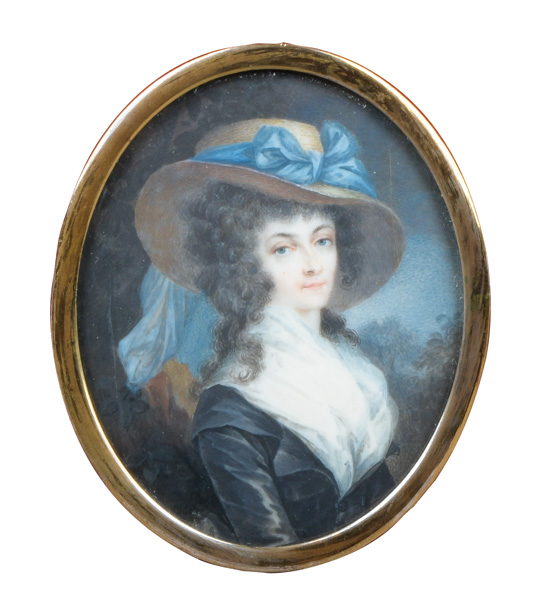 (1754-1825) Porträt von Elizabeth Le Touche (1756-1842). Bunt gemalt in Puderfarben und aquarelliert auf Elfenbeinplatte, re./mittig/monogr./dat. 1788, hi./Gl. in aufwendigem, vergoldetem Rahmen, verso blau guillochiert, hi./Gl. geflochtener Haarschmuck. Provenienz: Sotheby's, London 30. Juni 1980. Elfenbein-Gutachten und EU-Verkaufsgenehmigung liegen vor und können für EUR 150,00 erworben werden. 7,8 x 6,4 / 8 x 6,8 cm € 1.000,- - Katalog-Nr: 141Cécile Villeneuve, geb. Colombet