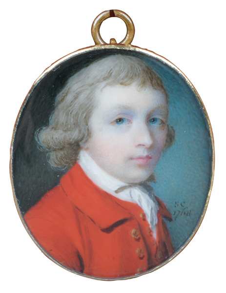 (1797-1853) Porträt eines Knaben. Bunt gemalt in Puderfarben und aquarelliert auf Elfenbeinplatte, re./mittig/sign., hi./Gl. in breitem Ahornrahmen mit Messingkranz. Provenienz: Christie's, London 6. Nov. 2001. Elfenbein-Gutachten und EU-Verkaufsgenehmigung liegen vor und können für EUR 150,00 erworben werden. 9,3 x 7,4 / 18,8 x 14,5 cm € 2.500,- - Katalog-Nr: 133Englischer Miniaturist