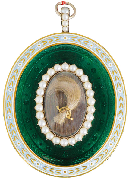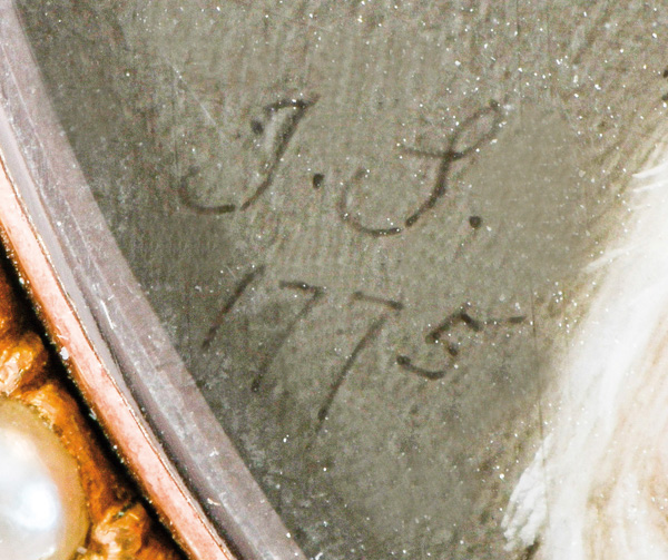 (1742/43-1811) Porträt einer Dame. Bunt gemalt in Puderfarben und aquarelliert auf Elfenbeinplatte, li./mittig/monogr./dat. 1775, hi./Gl. in 18 kt Goldrahmen mit Perlen- und Diamantbesatz; verso hi./Gl. geflochtene Haararbeit und ligiertes Monogramm „JF“. Provenienz: Bonhams, London 22. April 2004, GBP 81.000,00, The Albion Collection. Elfenbein-Gutachten und EU-Verkaufsgenehmigung liegen vor und können für EUR 150,00 erworben werden. 4,7 x 3,8 / 6,3 x 4,4 cm € 15.000,- - Katalog-Nr: 147John Smart