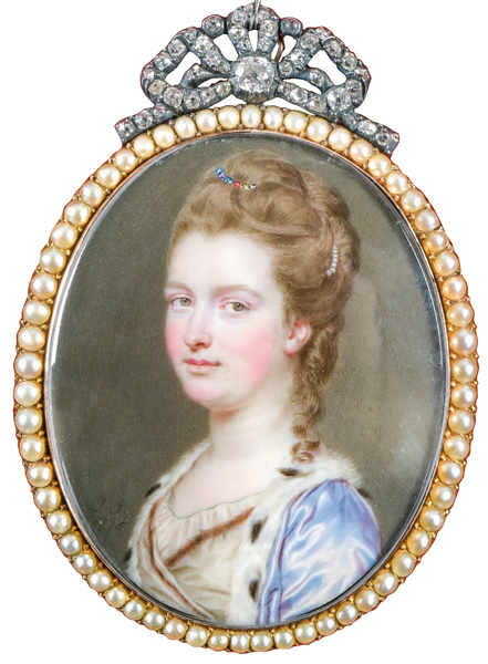 (1742/43-1811) Porträt einer jungen Dame in einem weißen Seidenkleid mit Perlen- und Smaragdsaum, hellblauem Seidenüberwurf mit Pelzbesatz, weiße Feder und Perlen im hochgesteckten Haar. Exzellent bunt gemalt in Puderfarben und aquarelliert auf Elfenbeinplatte, li./mittig/monogr./dat. 1776, hi./Gl. in 14 kt Goldrahmen mit -rückseite und Diamantbesatz. Provenienz: Slg. Mrs. Fleischmann, London 1912; Sotheby's, London 7. Mai 1946, Ashcroft Collection; Sotheby's, London 27. Feb. 1990; Christie's, London 9. Dez. 2003, GBP 48.500,00.. Literatur: K. Henninger-Tavcar, „Miniaturporträts“, Pforzheim 1995, S. 267. Ausstellung: „Exposition de la miniature“, Hôtel Goffinet, Brüssel 1912, Nr. 330 (als Leihgabe von Mrs. Fleischmann, London). Elfenbein-Gutachten und EU-Verkaufsgenehmigung liegen vor und können für EUR 150,00 erworben werden. 4,7 x 4 / 5,4 x 4,5 cm € 15.000,- - Katalog-Nr: 148John Smart