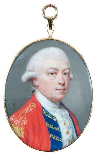 (1742/43-1811) Porträt eines engl. Offiziers mit gepudertem Haar. Bunt gemalt in Puderfarben und aquarelliert auf Elfenbeinplatte, li./mittig/monogr./dat. 1781, hi./Gl. in 18 kt Goldrahmen mit -rückseite. Provenienz: Christie's, London 9. Dez. 2003, GBP 22.000,00. Elfenbein-Gutachten und EU-Verkaufsgenehmigung liegen vor und können für EUR 150,00 erworben werden. 5 x 3,6 cm € 9.000,-
