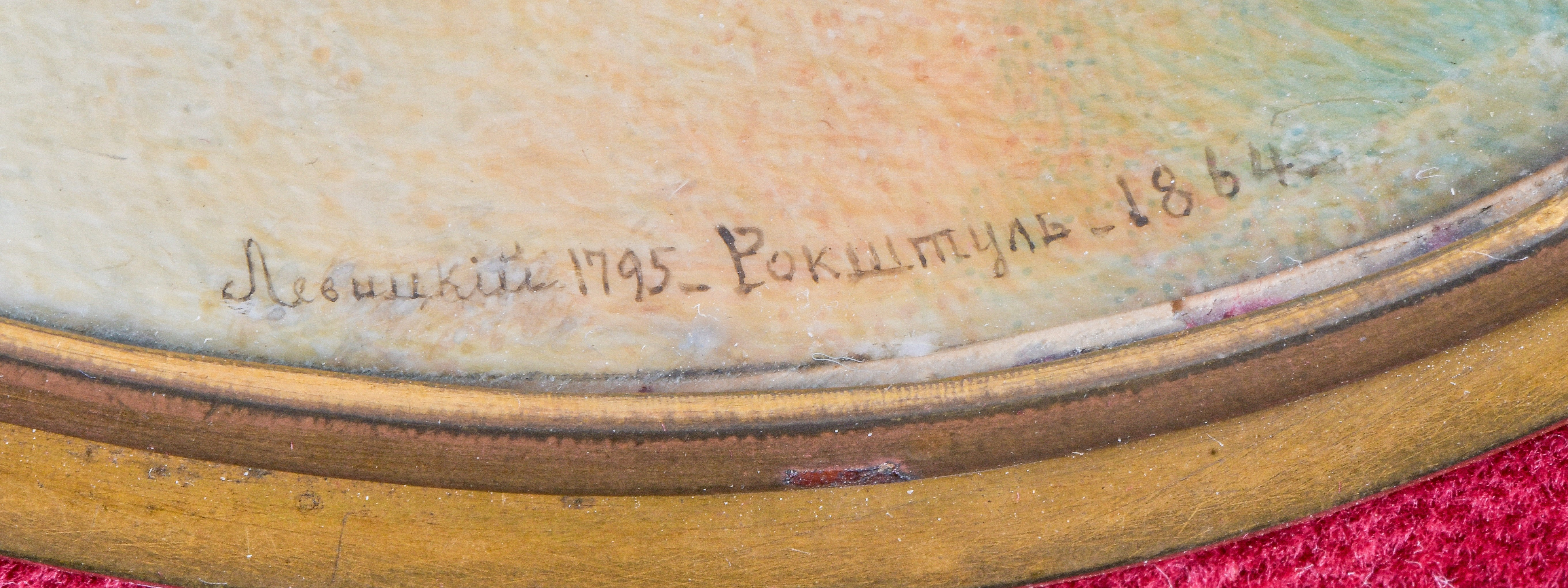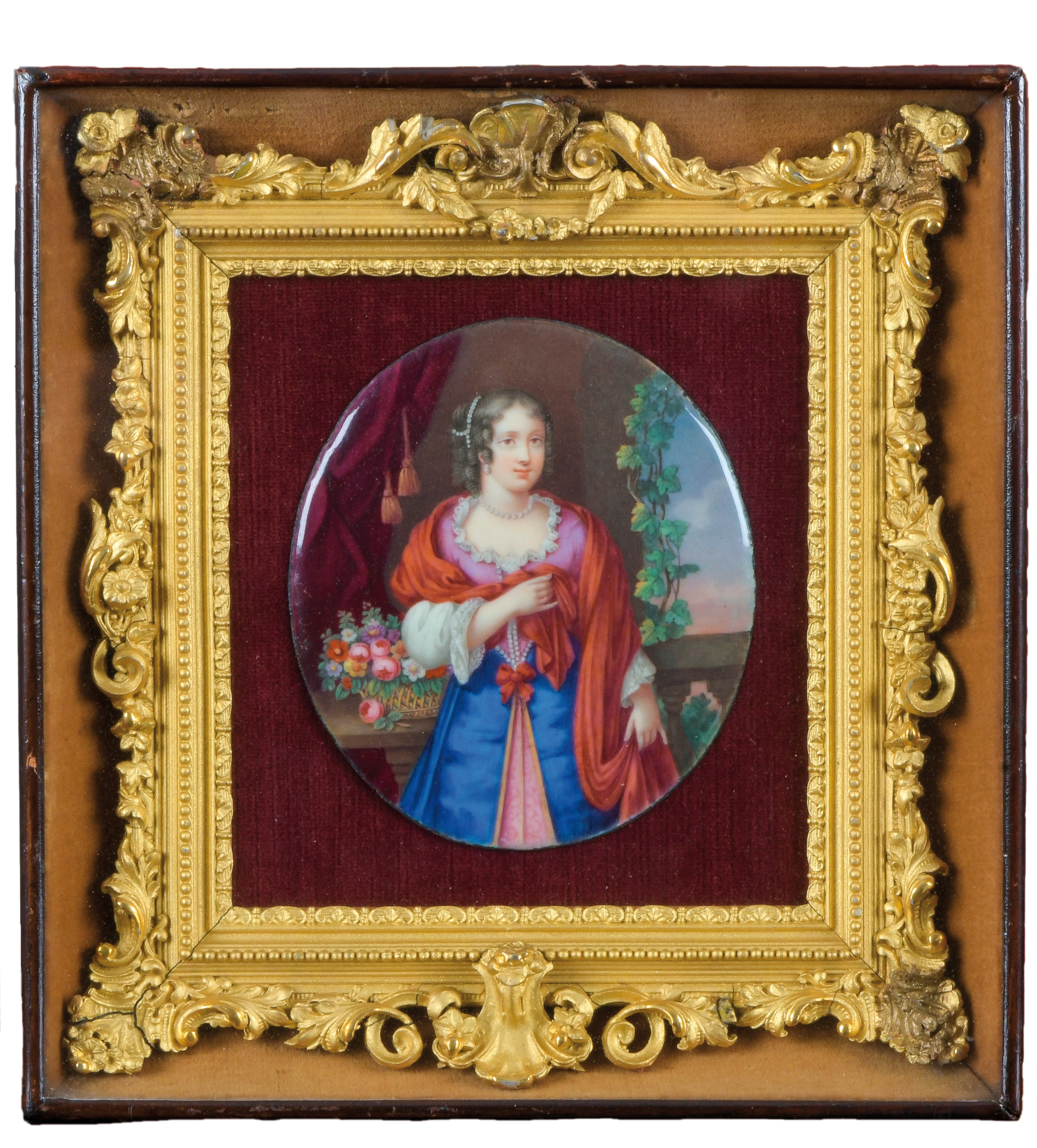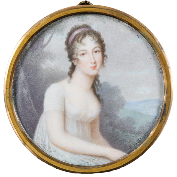 Porträt wohl von der Großfürstin Maria Pawlowna (1786-1859). Bunt gemalt in Puderfarben und aquarelliert auf Elfenbeinplatte, li./mittig/sign., verso bez., hi./Gl. in samtbezogenem Rahmen mit Messingkranz. Provenienz: Antiquitäten Gertrud Rudigier, München 1982. Elfenbein-Gutachten und EU-Verkaufsgenehmigung liegen vor und können für EUR 150,00 erworben werden.