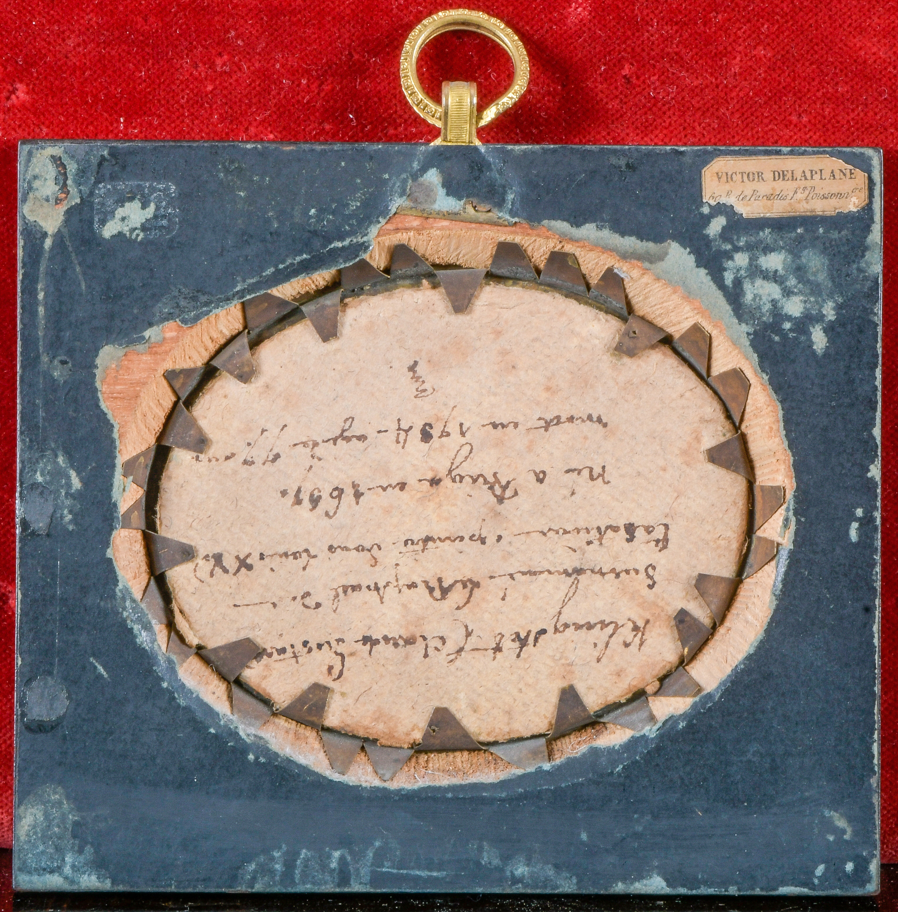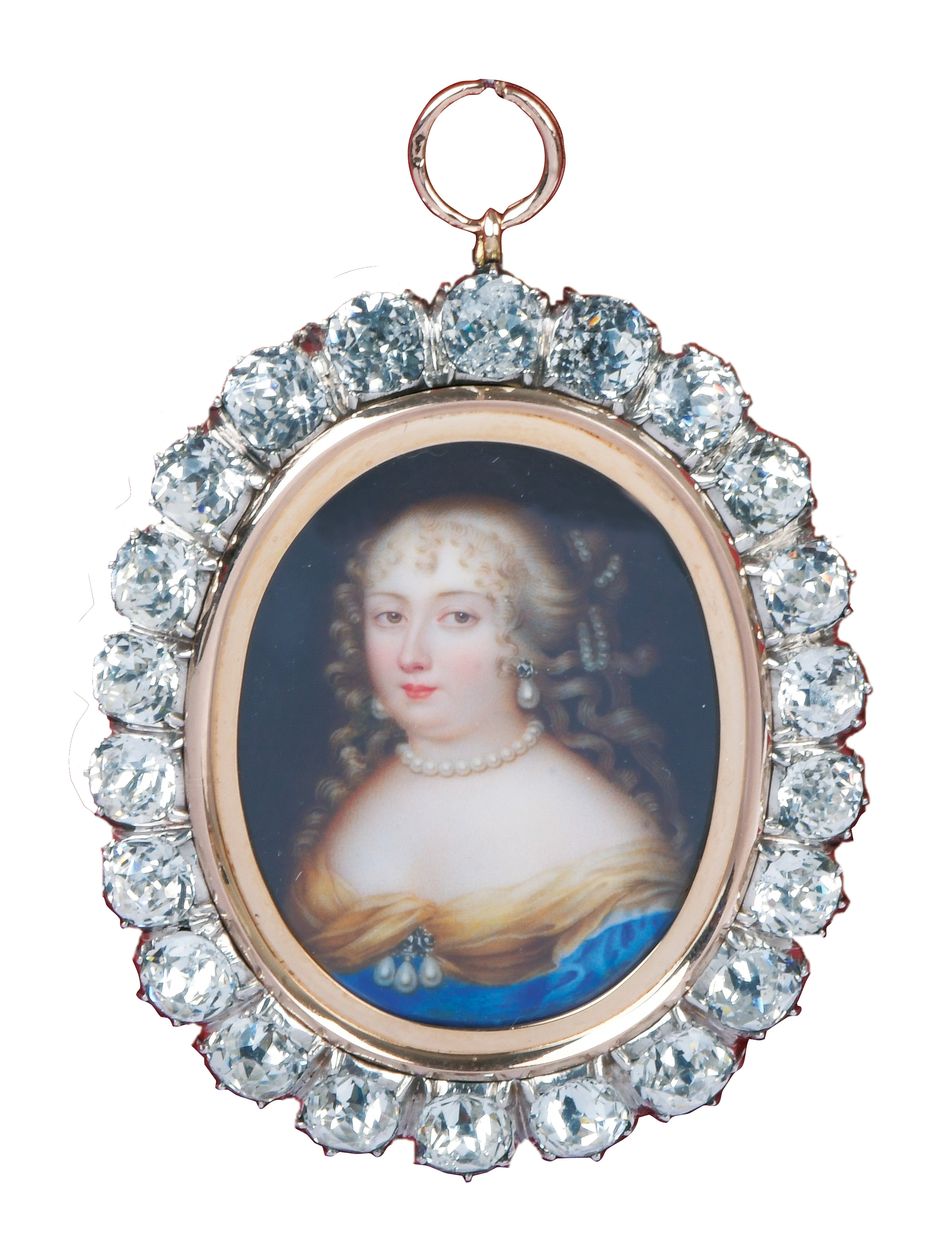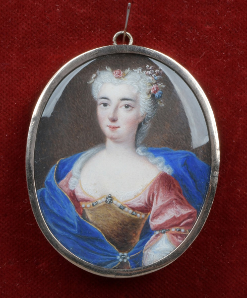 Porträt einer Dame. Bunt gemalt in Puderfarben und aquarelliert auf Pergament, hi./Gl. in schichtem 14 kt Gelbgoldrahmen mit -rückplatte. Provenienz: Sotheby's, Genf 17. Mai 1984.