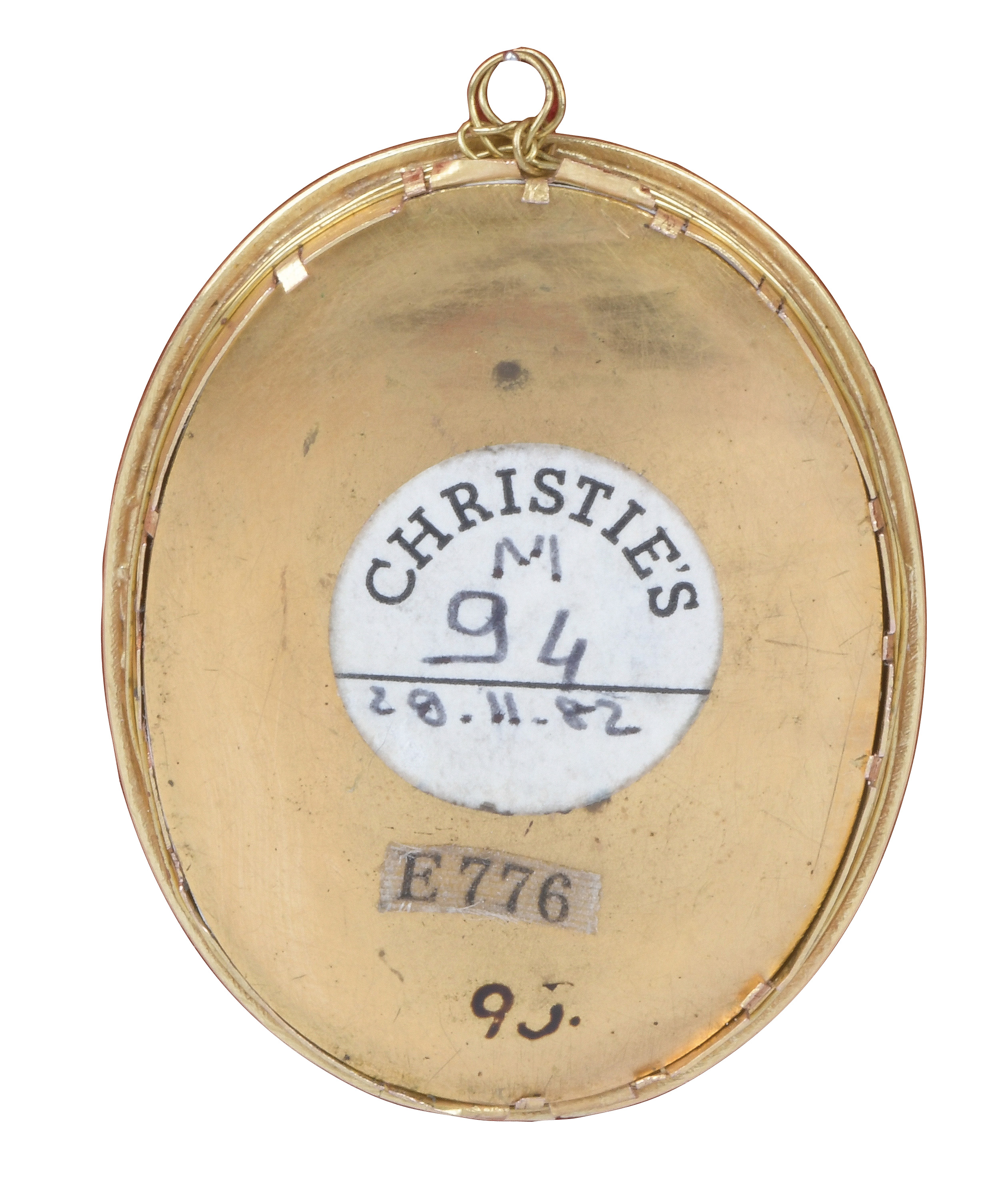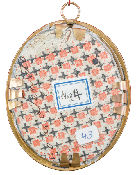 Porträt eines Offiziers mit gepudertem Haar. Bunt gemalt in Puderfarben und aquarelliert auf Elfenbeinplatte, li./mittig/monogr./dat. 1774, in 18 kt Goldrahmen mit -rückseite und Hängeöse in Spiralform. Provenienz: Christie's, London 25. Mai 2004, GBP 18.000,00. Elfenbein-Gutachten und EU-Verkaufsgenehmigung liegen vor und können für EUR 150,00 erworben werden.