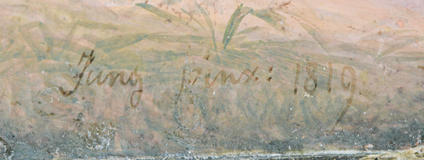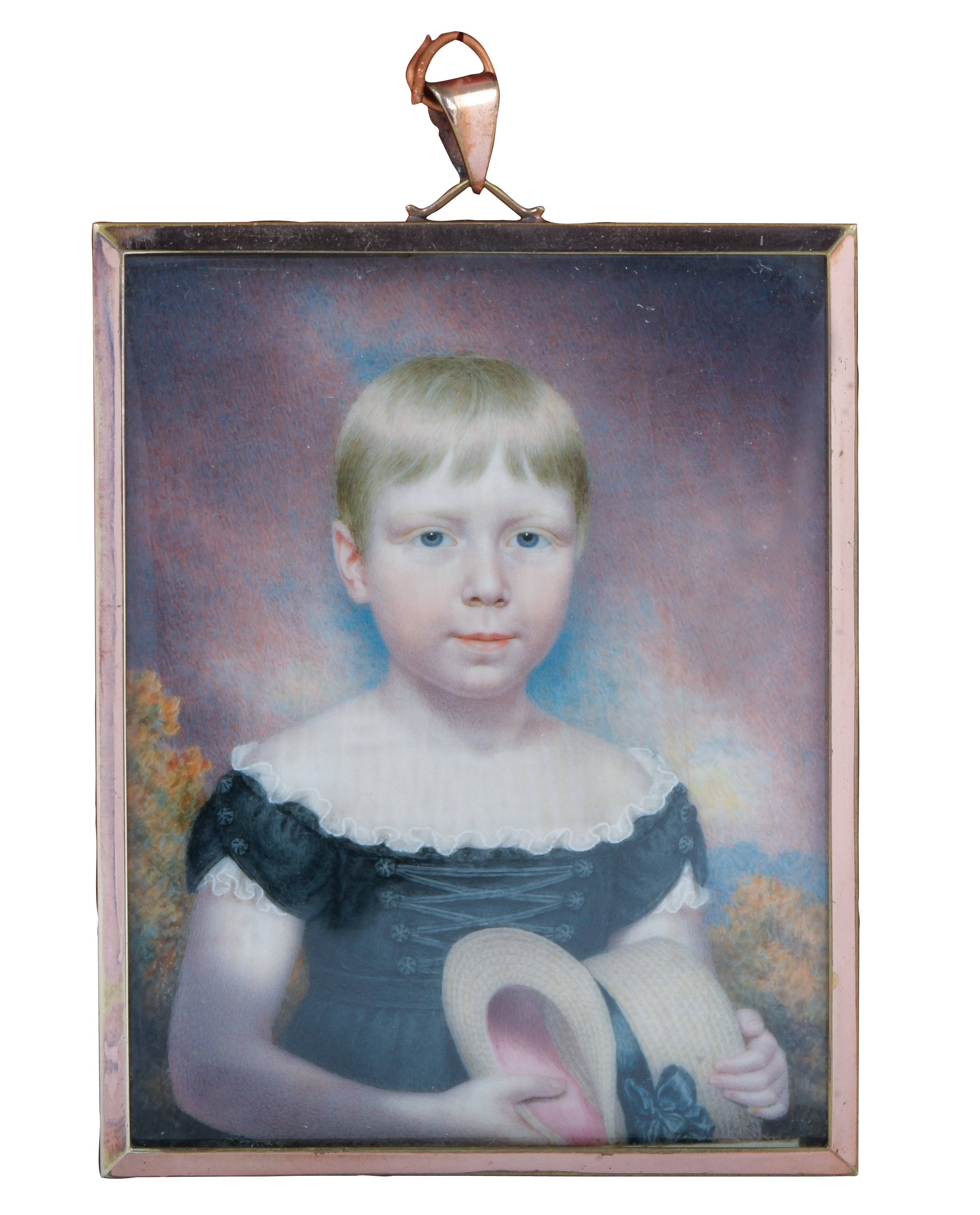 Porträt eines Mädchens mit Strohhut. Bunt gemalt in Puderfarben und aquarelliert auf Elfenbeinplatte, li./mittig/sign./dat. 1824, hi./Gl. in schlichtem, goldfarbigem Rahmen. Provenienz: Kunsthandel Edwin Bucher, Basel 1979. Elfenbein-Gutachten und EU-Verkaufsgenehmigung liegen vor und können für EUR 150,00 erworben werden.