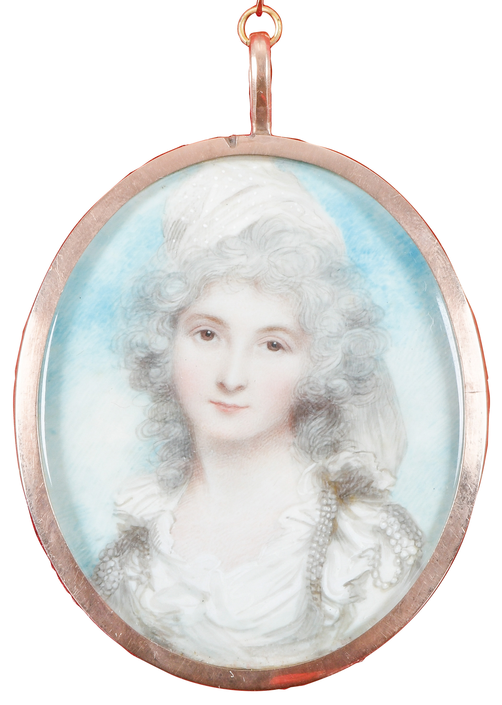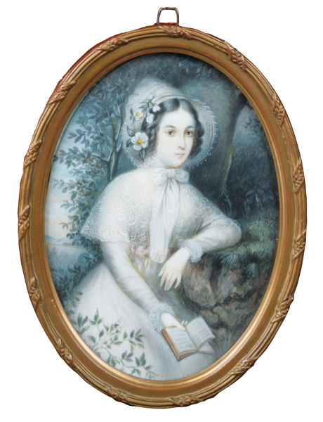 Porträt einer Dame mit aufgeschlagenem Buch. Bunt gemalt in Puderfarben und aquarelliert auf Elfenbein, re./u./sign., hi./Gl. in schlichtem Holzrahmen mit Stuckrelief, auf Kreidegrund gold gefasst. Provenienz: Christie's, London 27. Nov. 1984. Elfenbein-Gutachten und EU-Verkaufsgenehmigung liegen vor und können für EUR 150,00 erworben werden.