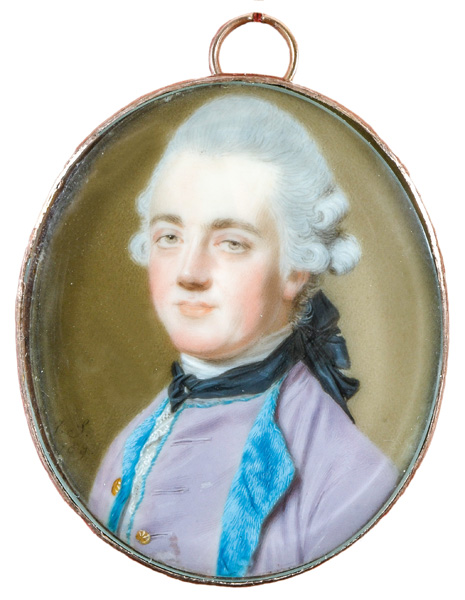 Porträt eines Herren. Bunt gemalt in Puderfarben und aquarelliert auf Pergament, hi./Gl. in zeitgenössischem, vergoldetem Louis XVI-Bronzerahmen. Provenienz: Sotheby's, Genf 6. Mai 1981.