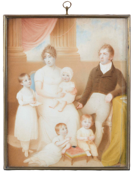 Porträt der Familie James Ryan mit Ehefrau und ihren vier Kindern. Bunt gemalt in Puderfarben und aquarelliert auf Elfenbein, hi./Gl. gerahmt. (seitl. gesprungen) Provenienz: Christie's, London 13. Juli 1982. Elfenbein-Gutachten und EU-Verkaufsgenehmigung liegen vor und können für EUR 150,00 erworben werden.