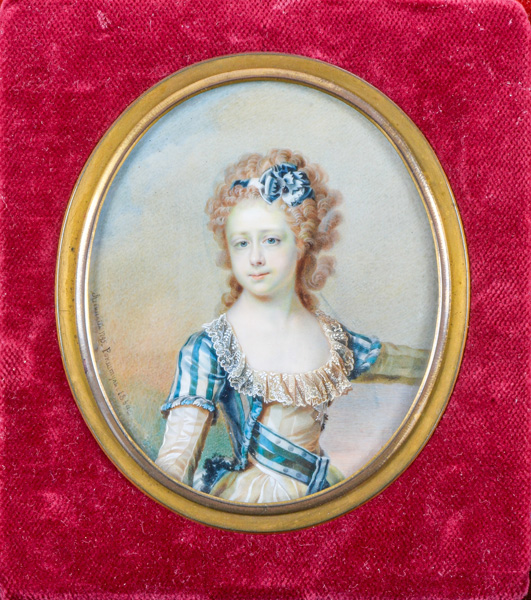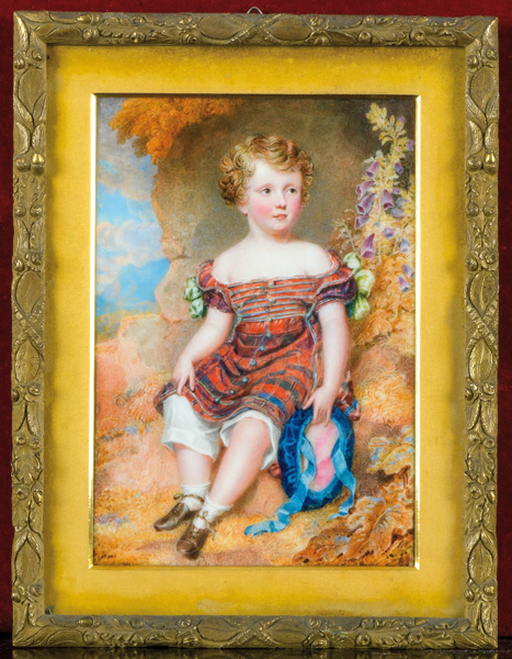 Porträt von Master Balcarres B.W. Ramsay. Bunt gemalt in Puderfarben und aquarelliert auf Elfenbeinplatte, li./u./sign., mit Passepartout hi./Gl. in aufwendig mit Eichenlaub und Eicheln reliefiertem, feuervergoldetem Bronzerahmen. Provenienz: Sotheby's, London 28. Juli 1980. Elfenbein-Gutachten und EU-Verkaufsgenehmigung liegen vor und können für EUR 150,00 erworben werden.