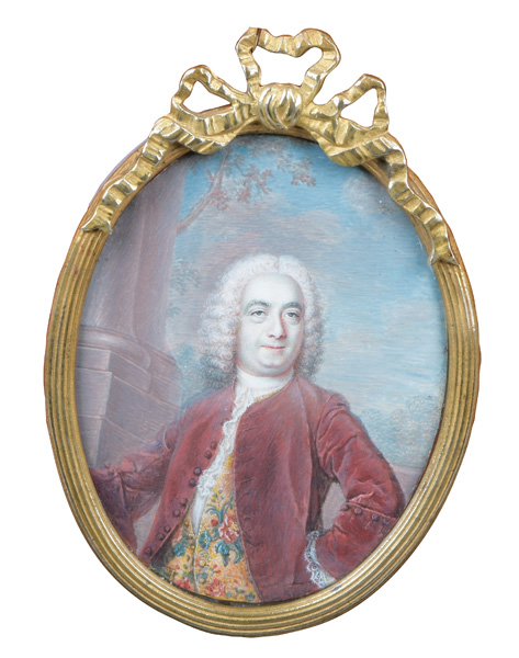 Porträt eines Edelmannes. Bunt gemalt in Puderfarben und aquarelliert auf Elfenbeinplatte, li./u./monogr./dat. 1769, hi./Gl. in 8 kt Goldrahmen mit -rückseite. Provenienz: Bonhams, London 28. Juni 2012, GBP 22.000,00. Elfenbein-Gutachten und EU-Verkaufsgenehmigung liegen vor und können für EUR 150,00 erworben werden.