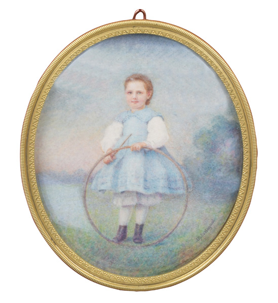 Porträt eines stehenden Mädchens mit Spielreifen. Bunt gemalt in Puderfarben und aquarelliert auf Pergament, re./u./sign., hi./Gl. in aufwendig fein ziseliertem und graviertem Messingrahmen. Provenienz: Koller, Zürich 23. Mai 1981.