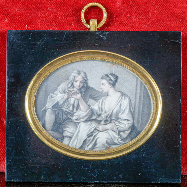 Porträt eines Kavaliers beim Einfädeln eines Fadens. Bunt gouachiert auf Papier, hi./Gl. in ebonisiertem Holzrahmen mit Messingkranz. Provenienz: Antiquitäten Gertrud Rudigier, München 1980.