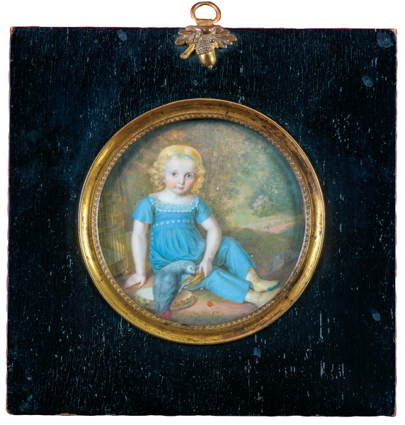 Porträt eines sitzenden Mädchens beim Füttern eines Papageien. Bunt gemalt in Puderfarben und aquarelliert auf Elfenbeinplatte, u./mittig/sign./dat. 1819, hi./Gl. in ebonisiertem Holzrahmen mit Messingkranz. Provenienz: Antiquitäten Karl-Friedrich Schulz, Mannheim 1981. Elfenbein-Gutachten und EU-Verkaufsgenehmigung liegen vor und können für EUR 150,00 erworben werden.