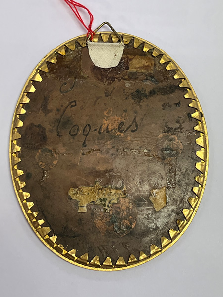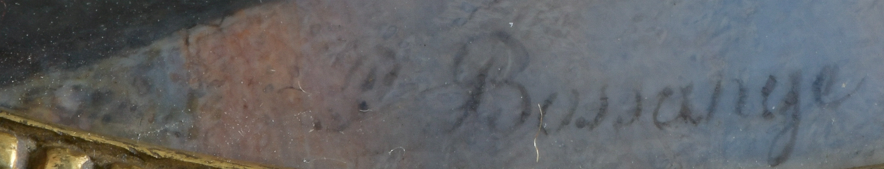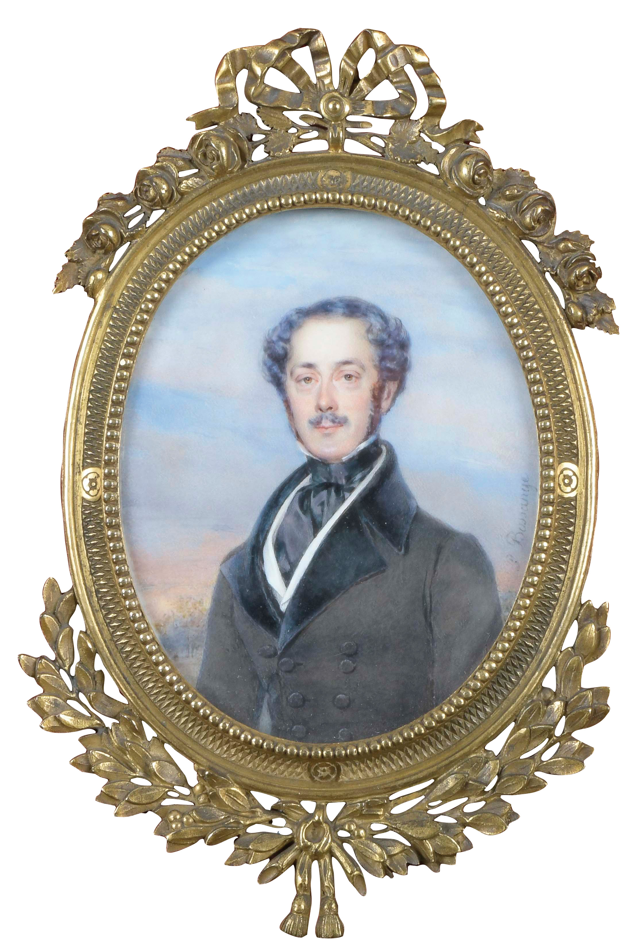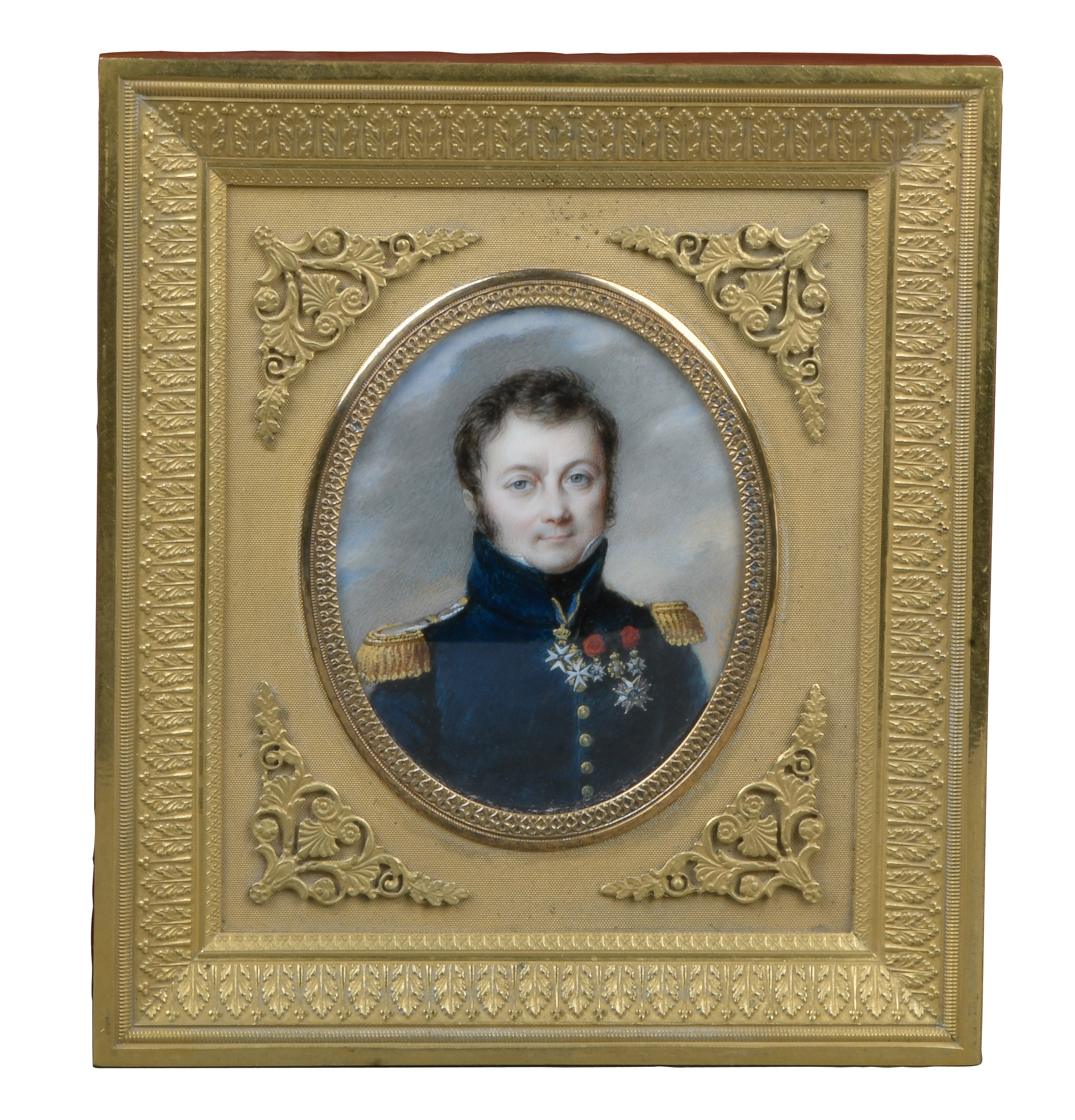 Porträt des Grafen Louis de Schonendall d'Arimont. Bunt gemalt in Puderfarben und aquarelliert auf Elfenbeinplatte, re./mittig/sign., hi./Gl. in aufwendig reliefiertem feuervergoldetem Bronzerahmen. Provenienz: Sotheby's, Genf 11. Mai 1983. Elfenbein-Gutachten und EU-Verkaufsgenehmigung liegen vor und können für EUR 150,00 erworben werden.