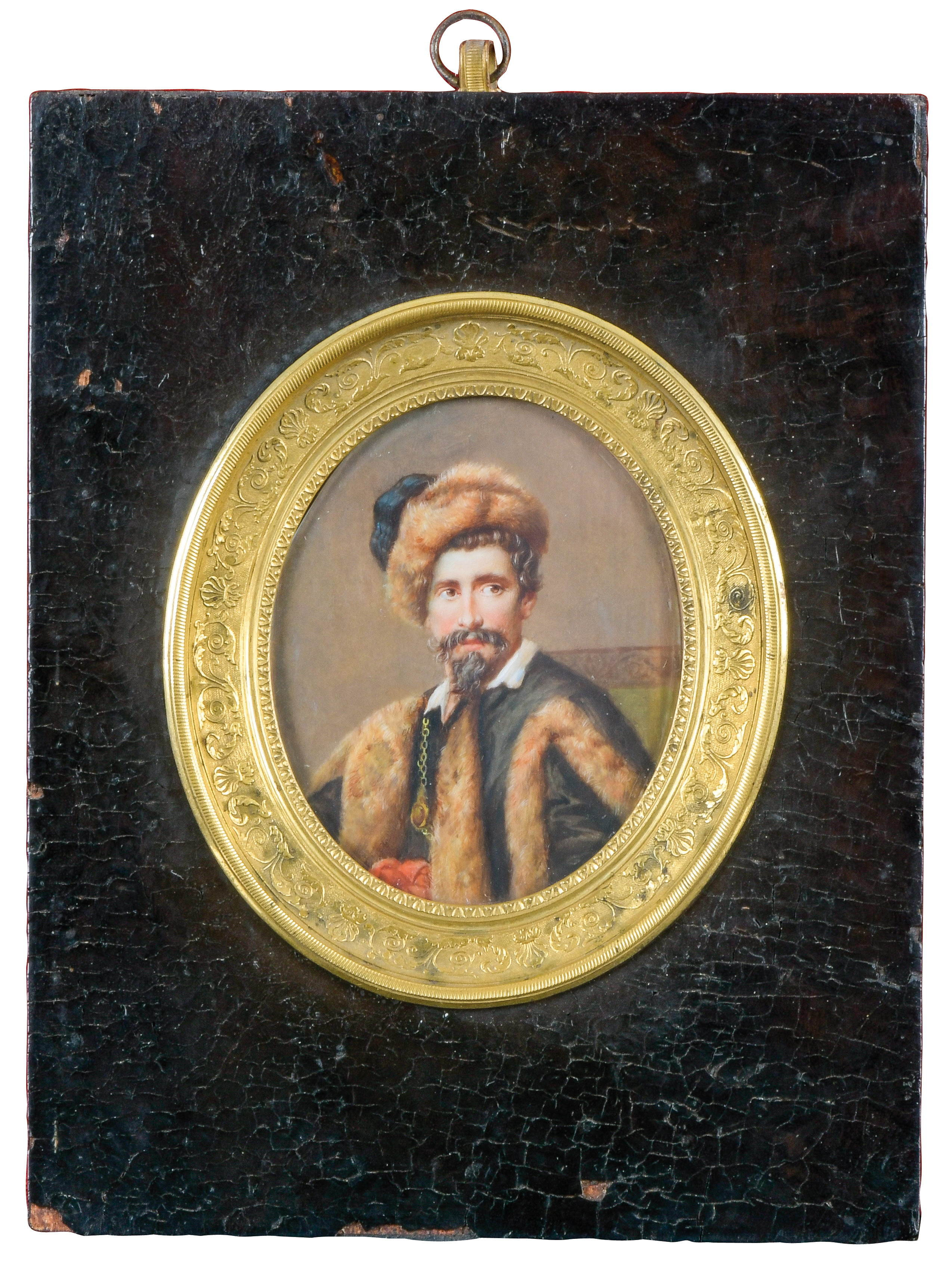 Porträt eines Herren mit Pelzmütze und Umhang. Bunt gemalt in Puderfarben und aquarelliert auf Elfenbeinplatte, hi./Gl. in ebonisiertem Rahmen mit reliefiertem Bronzekranz. Provenienz: Antiquitäten Gertrud Rudigier, München 1980. Elfenbein-Gutachten und EU-Verkaufsgenehmigung liegen vor und können für EUR 150,00 erworben werden.
