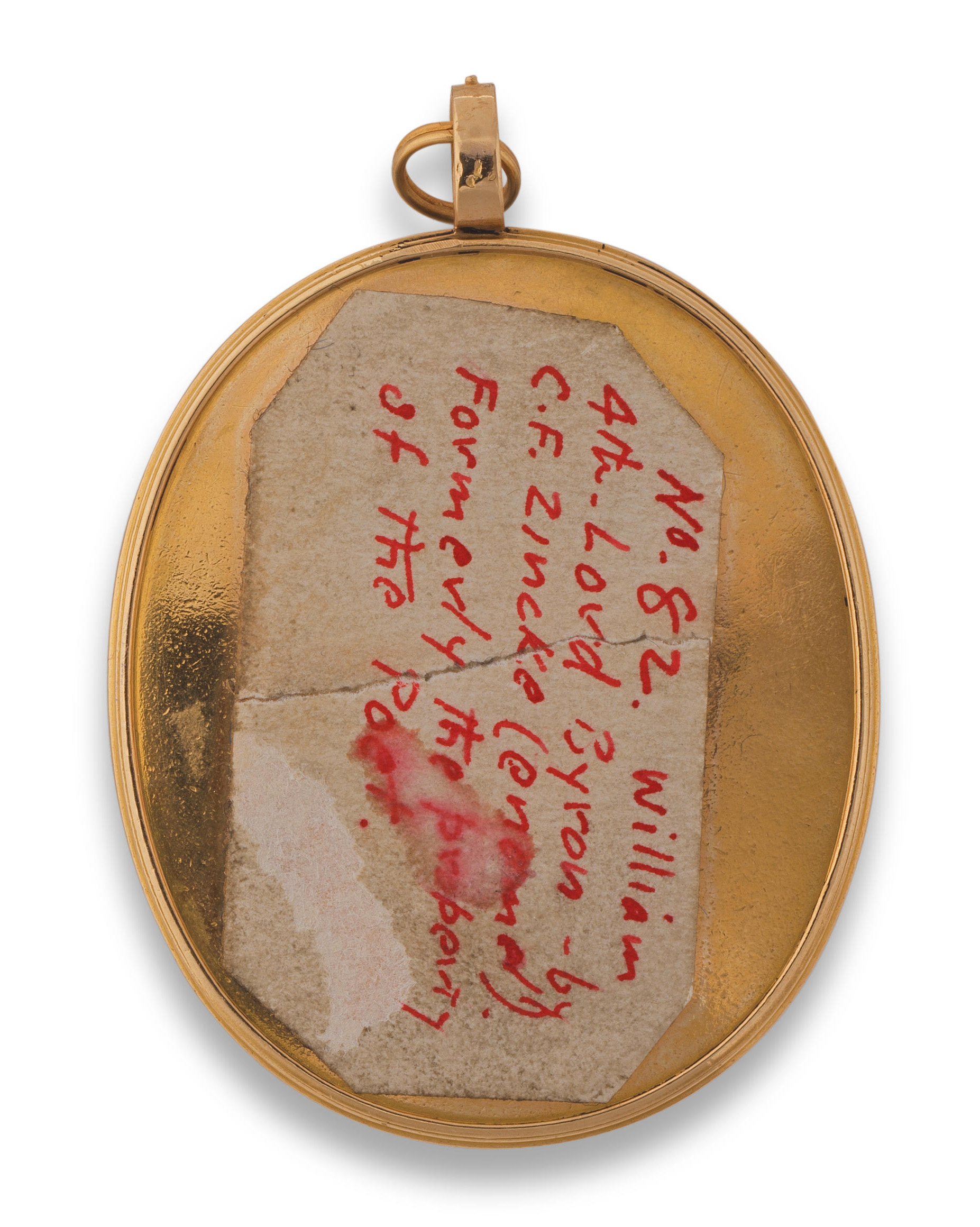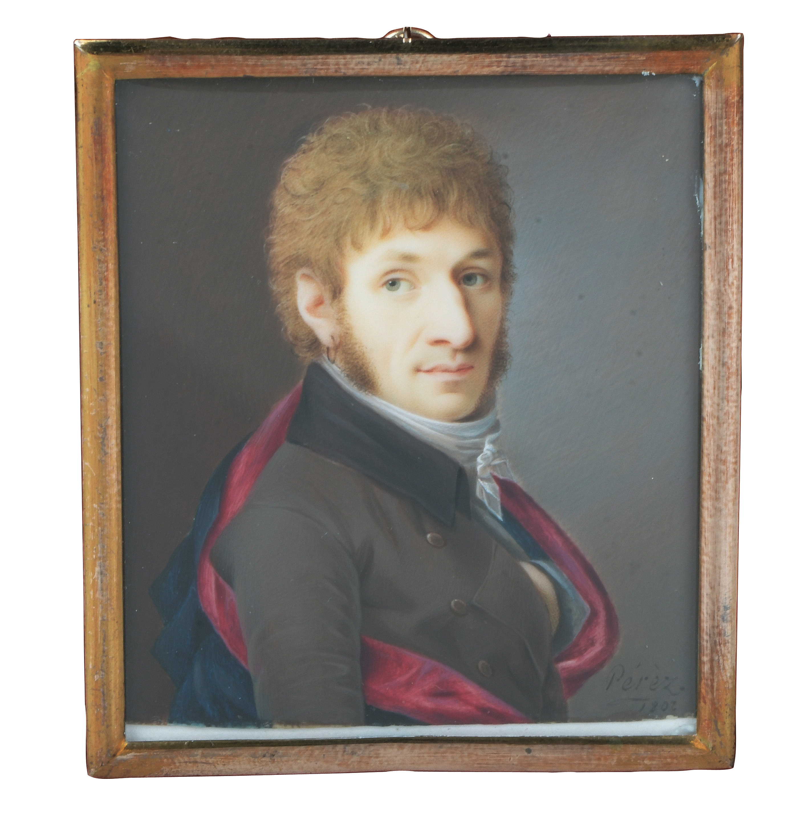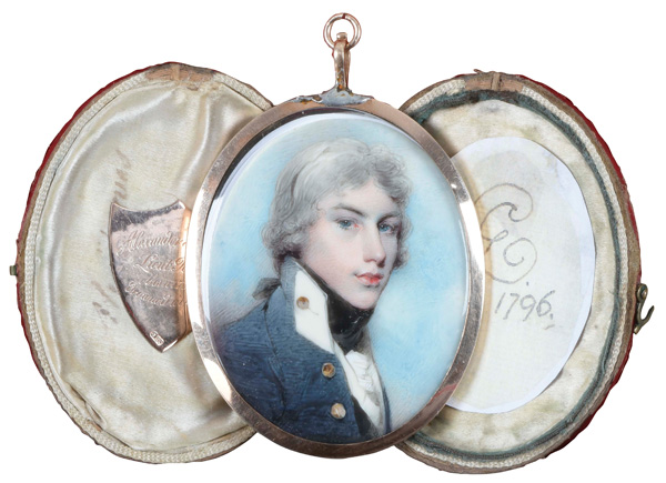 Porträt von Leutnant Alexander Purves (*1778). Bunt gemalt in Puderfarben und aquarelliert auf Elfenbeinplatte, hi./Gl. in 14 kt Goldrahmen, verso verglast mit geflochtener Haararbeit, rautenförmig präsentiert. Dazu aufklappbares rotes Etui mit beschrifteter Goldplatte und ovalem Papier, monogr./dat. „GC 1796“. Provenienz: Christie's, London 07. Okt. 1980. Elfenbein-Gutachten und EU-Verkaufsgenehmigung liegen vor und können für EUR 150,00 erworben werden.
