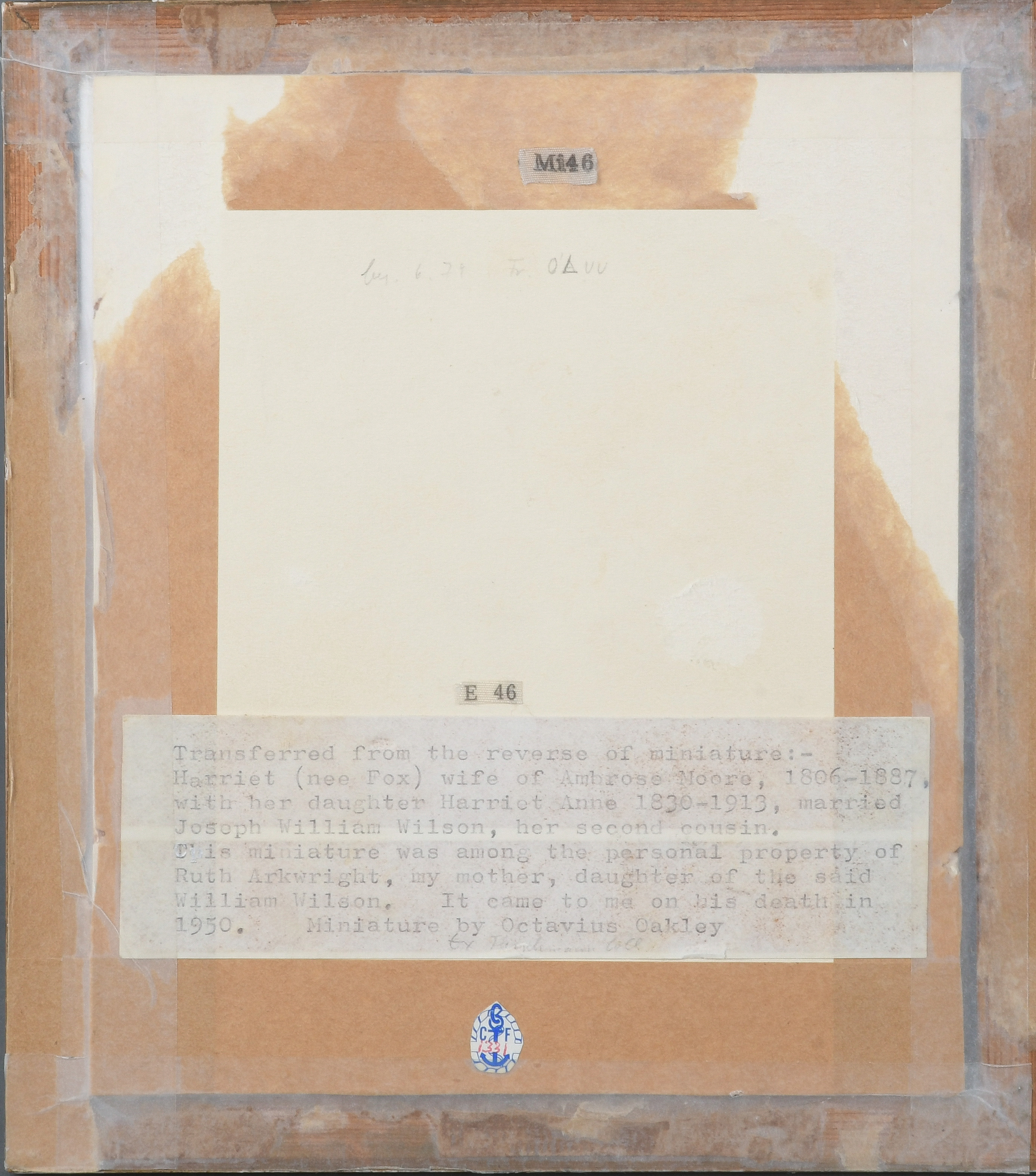 Porträt von Harriet, der Gattin von Ambrose Moore mit ihrer Tochter Harriet Ann (1830-1913). Bunt gemalt in Puderfarben und aquarelliert auf Elfenbeinplatte, hi./Gl. in Holzrahmen, auf Kreidegrund gold gefasst (gesprungen, besch.). Provenienz: Sotheby's, London 25. Juni 1979. Elfenbein-Gutachten und EU-Verkaufsgenehmigung liegen vor und können für EUR 150,00 erworben werden.