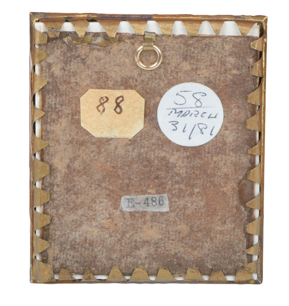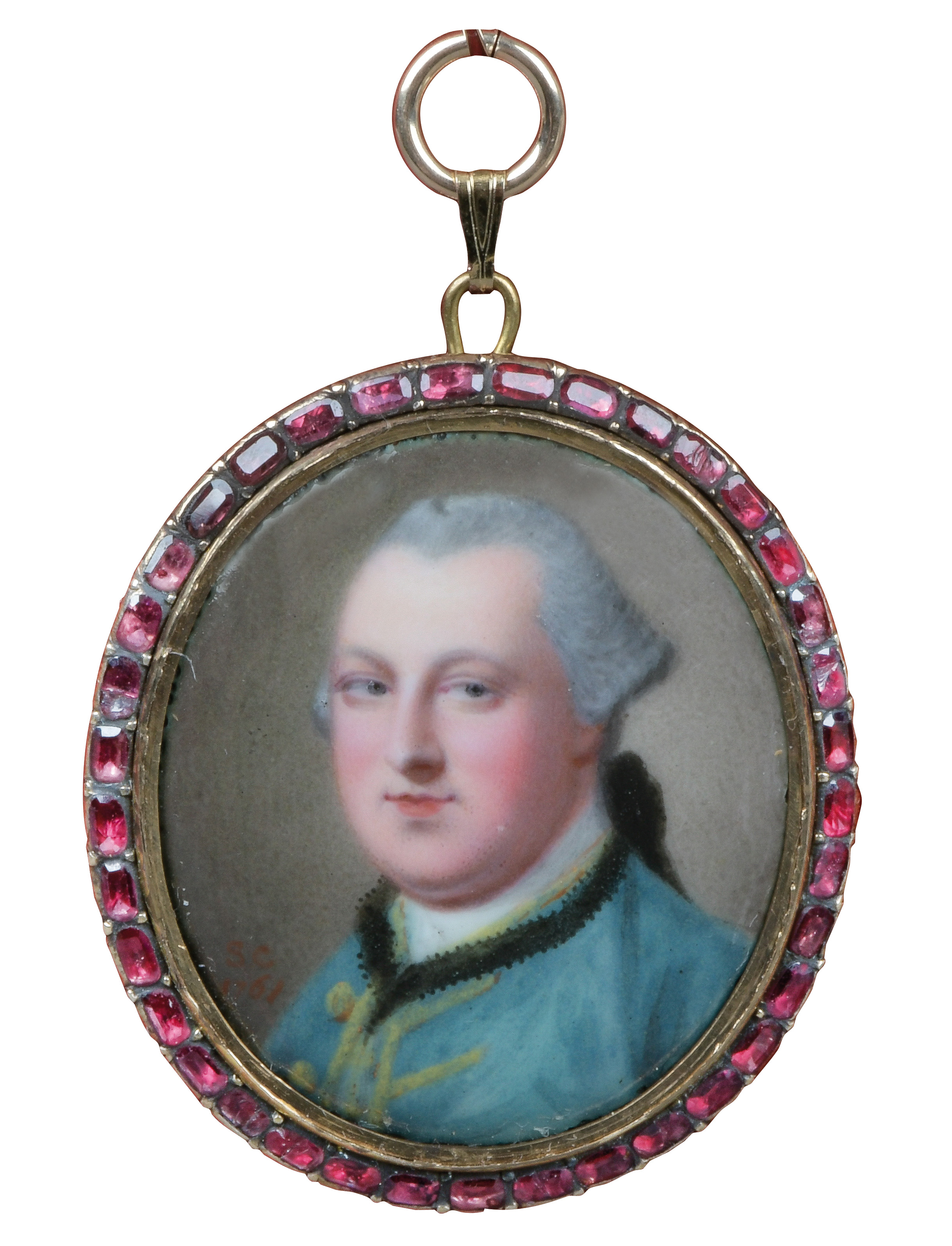 Porträt eines Herren. Bunt gemalt in Email auf Kupferplatte, li./mittig/sign./dat. 1761, in aufwendigem, vergoldetem Silberahmen, umlaufend besetzt mit Rubinsplittern und Rückplatte. Provenienz: Sotheby's, Zürich 6. Mai 1980.