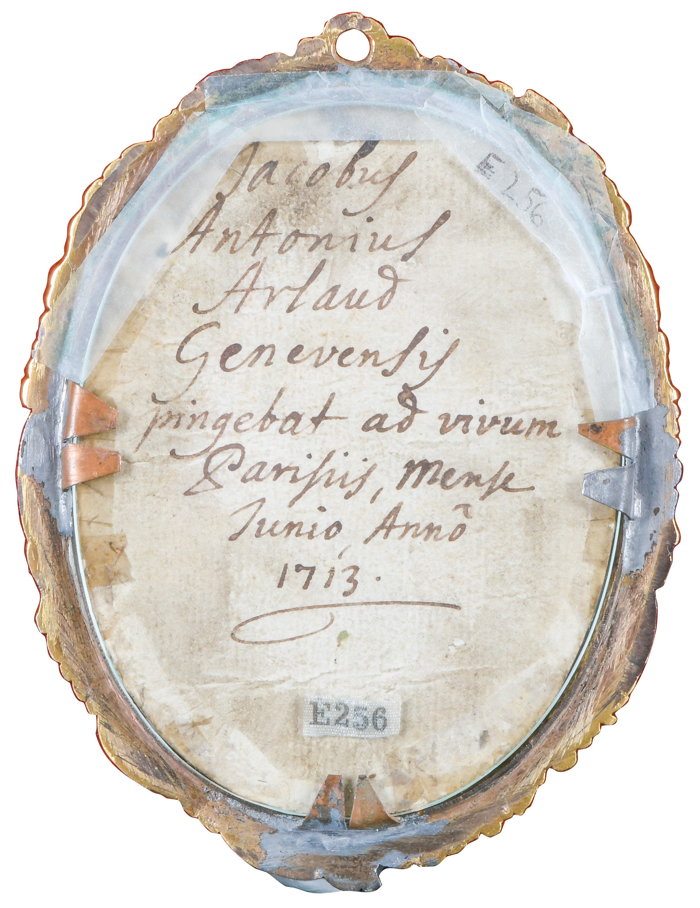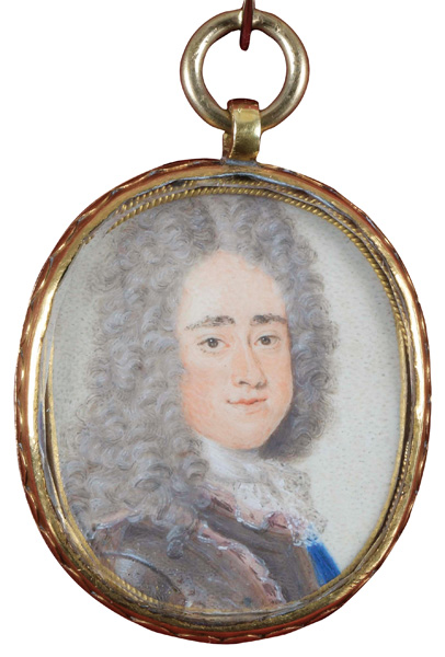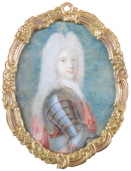 Porträt von Maximillian Emanuel von Bayern (1662-1726). Bunt gemalt in Puderfarben und aquarelliert auf Pergament, verso bez./dat. „Jacobus Antonius Arlaud Genevensis pingebat ad vivum Parisiis, Mense Junio Anno 1713“ , hi./Gl. in feuervergoldetem Bronzerahmen. Provenienz: Sotheby's, Zürich 6. Mai 1980.