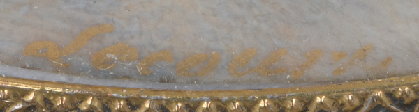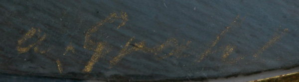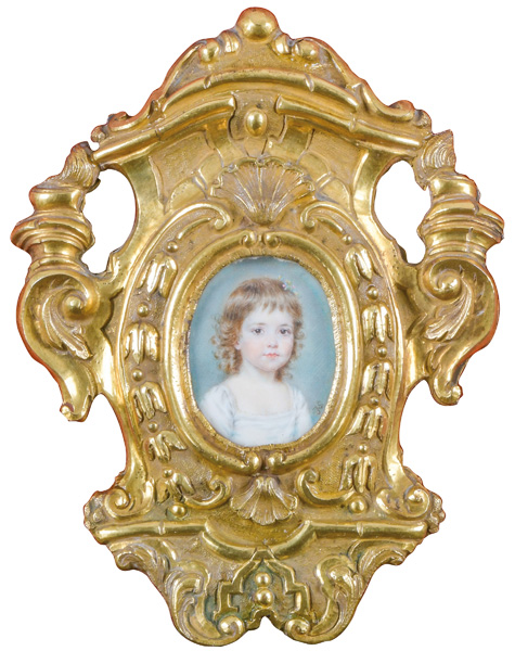 Porträt eines Mädchens. Bunt gemalt in Puderfarben und aquarelliert auf Elfenbeinplatte, re./u./monogr., hi./Gl. in aufwendig rocaillereliefiert durchbrochenem, feuervergoldetem Bronzerahmen. Provenienz: Antiquitäten Gertrud Rudigier, München 1980. Elfenbein-Gutachten und EU-Verkaufsgenehmigung liegen vor und können für EUR 150,00 erworben werden.