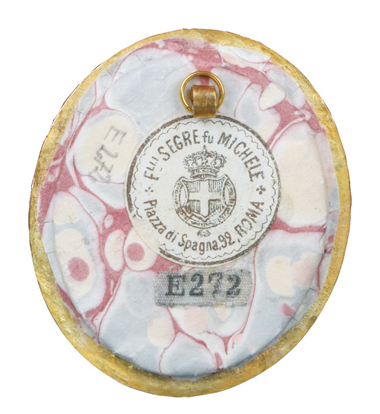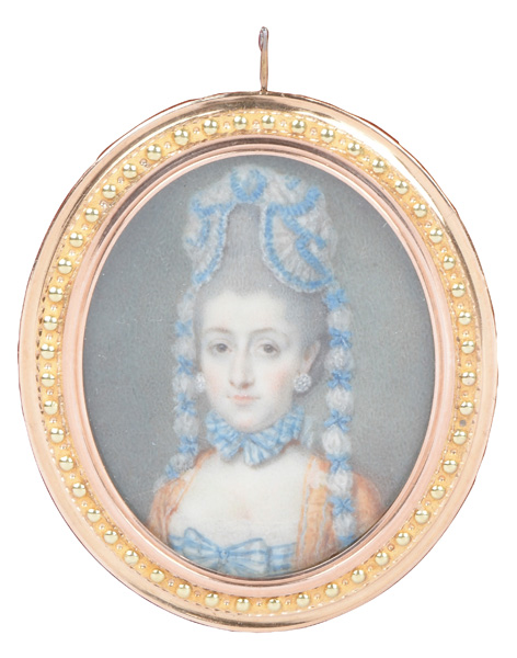 Porträt einer Dame. Bunt gemalt in Puderfarben und aquarelliert auf Elfenbeinplatte, mit Passepartout hi./Gl. in aufwendigem 18 kt Gelbgoldrahmen mit Perlfriesrelief. Provenienz: Sotheby's, Zürich 6. Mai 1980. Elfenbein-Gutachten und EU-Verkaufsgenehmigung liegen vor und können für EUR 150,00 erworben werden.