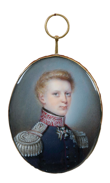 Porträt von Paul Friedrich Großherzog von Mecklenburg-Schwerin (1800-1842). Bunt gemalt in Puderfarben und aquarelliert auf Elfenbeinplatte, re./o./sign., hi./Gl. in vergoldetem Rahmen mit verglaster und beschrifteter Rückseite. Provenienz: Christie's, Genf 29. Nov. 1982. Elfenbein-Gutachten und EU-Verkaufsgenehmigung liegen vor und können für EUR 150,00 erworben werden.
