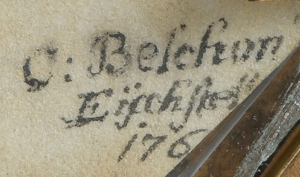 Porträt von Raimund Anton, Graf von Strasoldo-Ranziano (1718-1781), Fürstbischof von Eichstätt. Bunt gemalt in Puderfarben und aquarelliert auf Pergament, verso/re./sign./dat. 176(?), hi./Gl. in oktogonalem, profiliertem, ziseliertem, feuervergoldetem Bronzerahmen. Provenienz: Christie's, London 13. Okt. 1981.