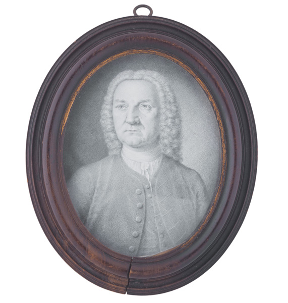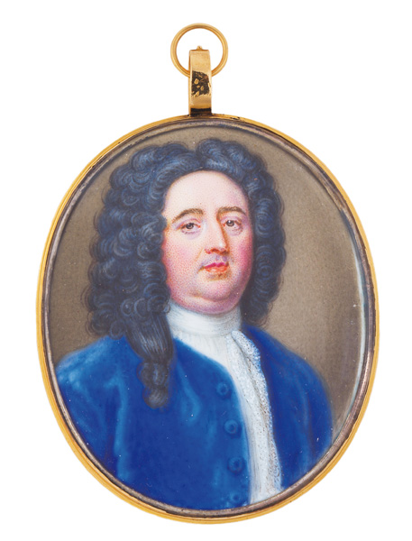 Porträt von Anton II, Herzog von Aldenburg (1681-1738). Bunt gemalt in Puderfarben und aquarelliert auf Pergament, ligiert monogr. „A.A.“, hi./Gl. in Goldrahmen mit -rückseite. Provenienz: Sotheby's, London 30. Juni 1980.