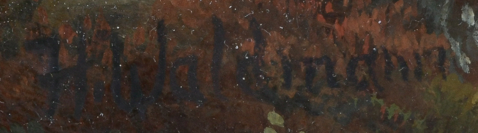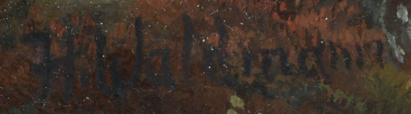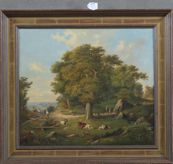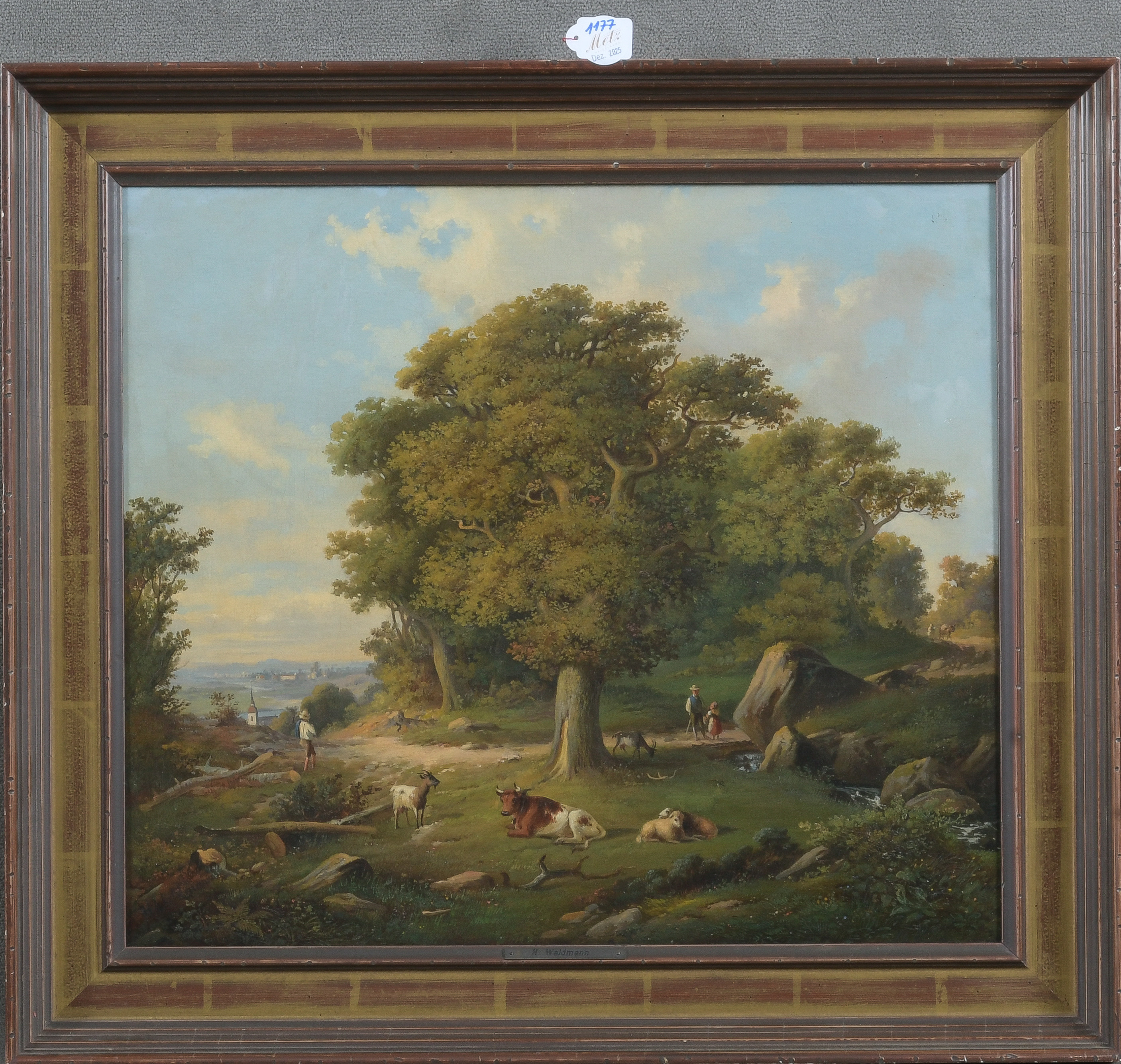 - Katalog-Nr: 1177H. Waldmann (Maler des 20. Jhs.). Panoramalandschaft mit Vieh vor Bäumen und Personenstaffage. Öl/Lw., li./u./sign., gerahmt, 46 x 53 cm.o.L.