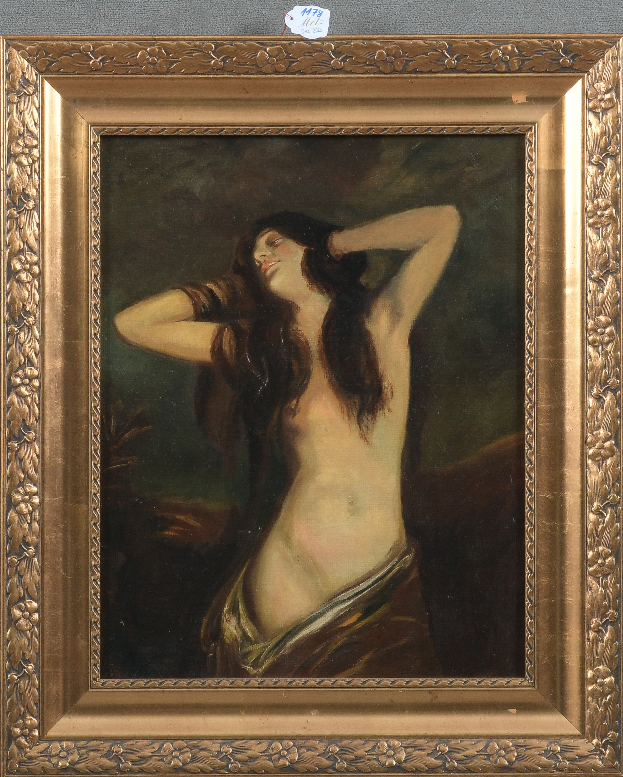 - Katalog-Nr: 1178Maler des 19./20. Jhs. Stehender weiblicher Halbakt. Öl/Lw., gerahmt, 50,5 x 39,5 cm.o.L.