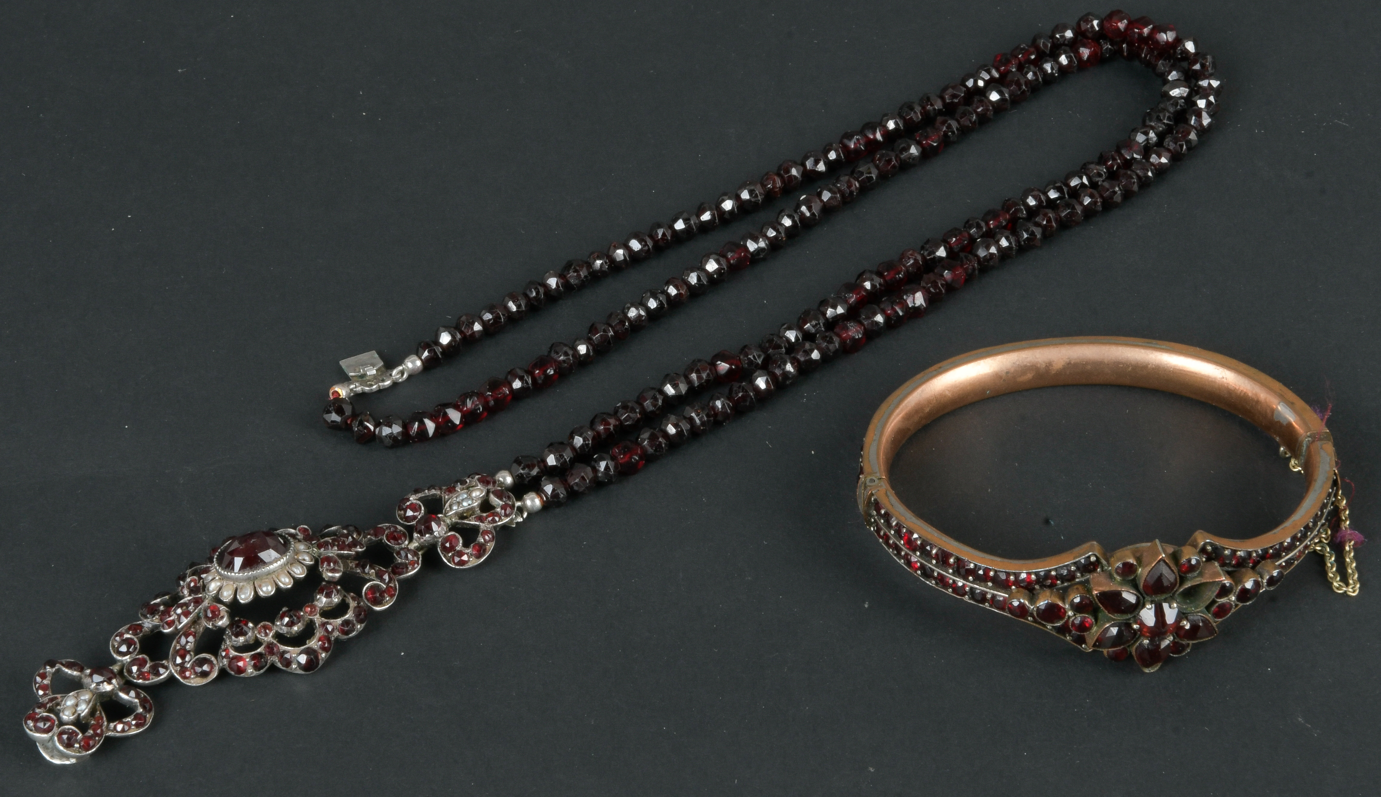 - Katalog-Nr: 1180Collier, Silber (L=40 cm), und Armreif, versilbert, je besetzt mit Granaten.o.L.