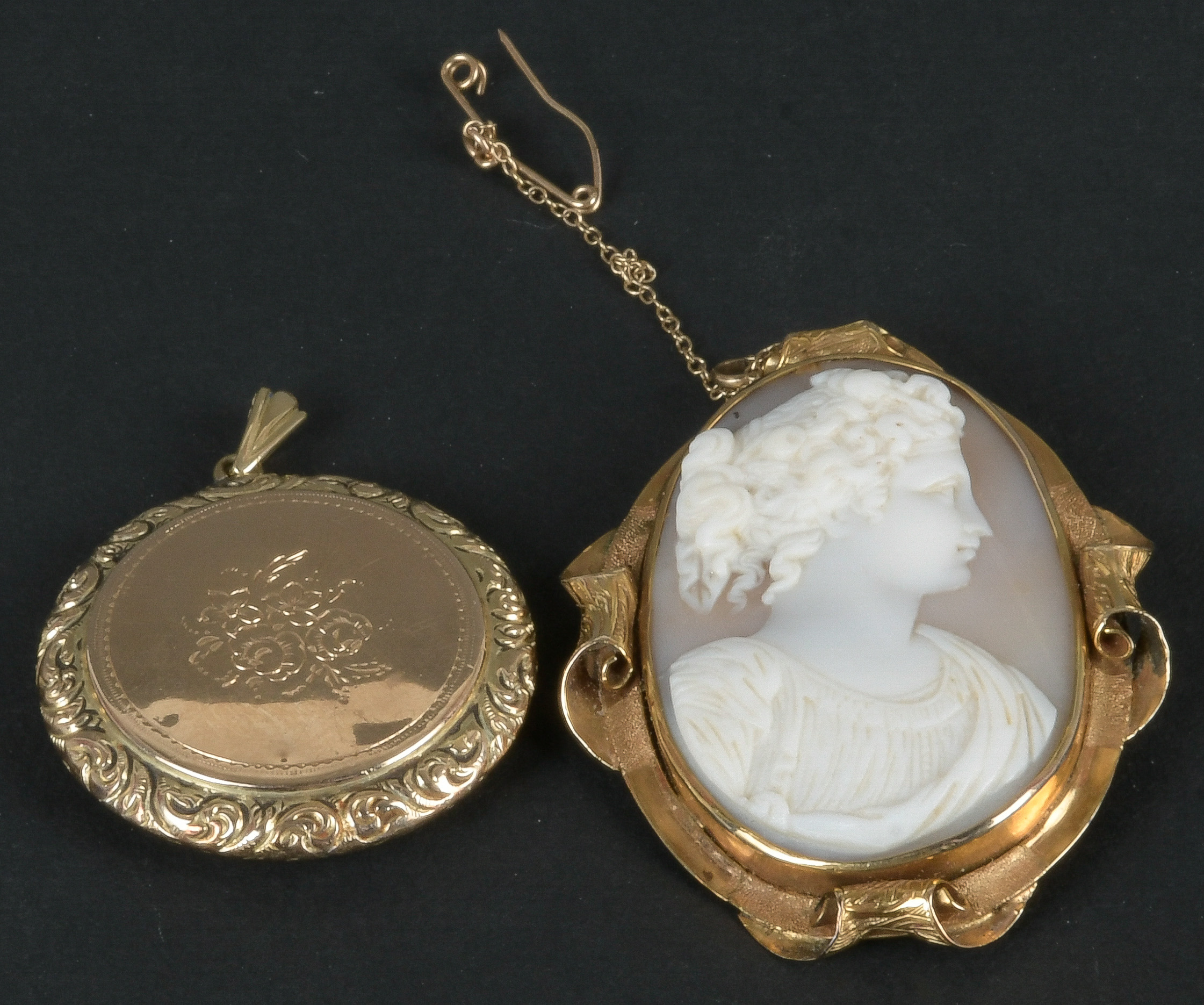- Katalog-Nr: 1183Brosche. 8 kt Gold, besetzt mit Muschelcamée, fein geschnitzt mit Frauenbüste; dazu Anhänger, 8 kt Gold, Gesamtgewicht ca. 15 g.o.L.