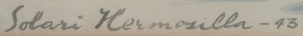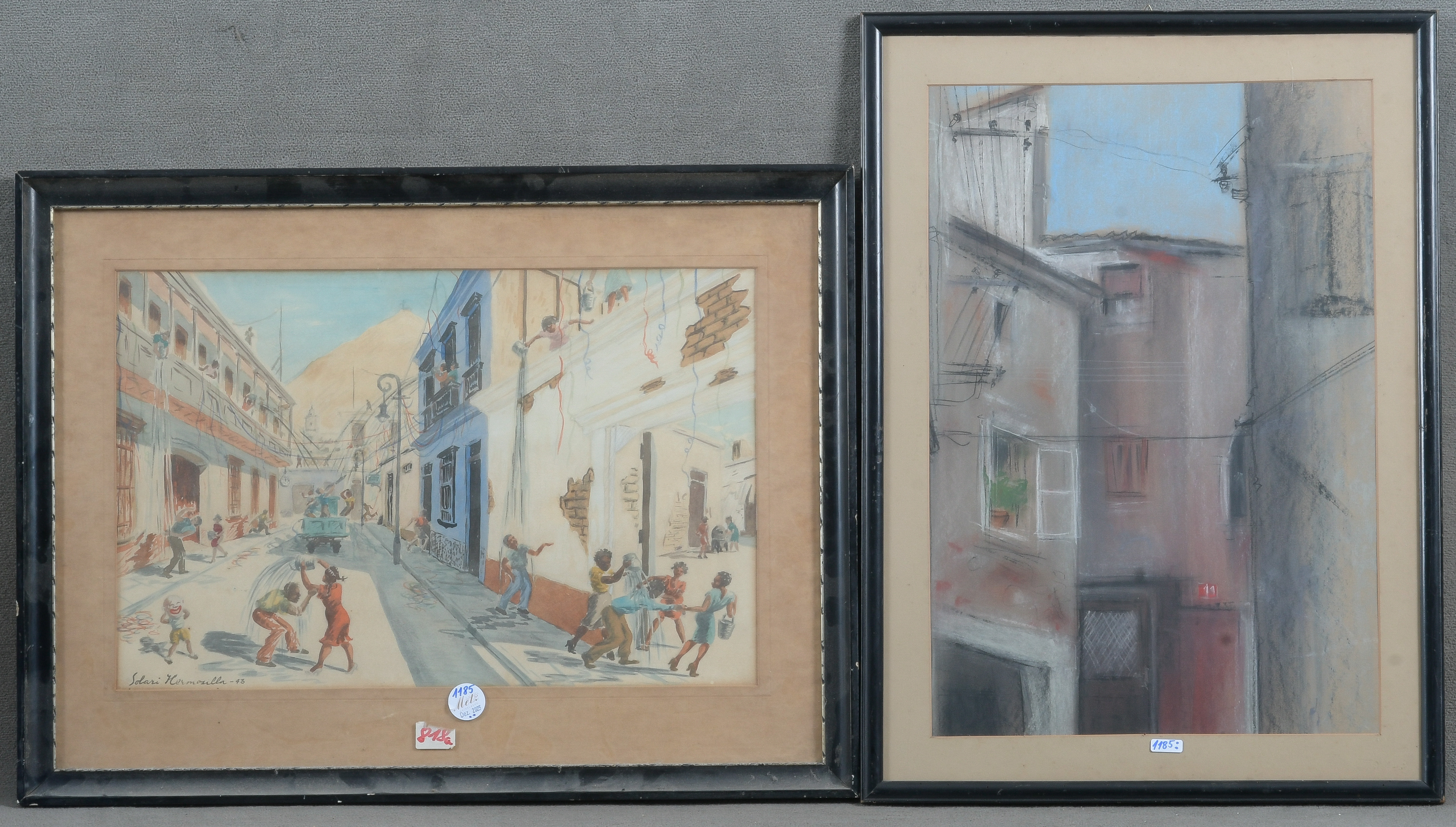 - Katalog-Nr: 1185Maler des 20. Jhs. Südländische Straßenflucht mit Personen beim Wasserspiel und Gebäudeansicht. Aquarell bzw. Mischtechnik/Papier, eines li./u./sign./dat. (19)43, mit Passepartout hi./Gl. gerahmt, 34 x 52 / 53 x 36 cm.o.L.